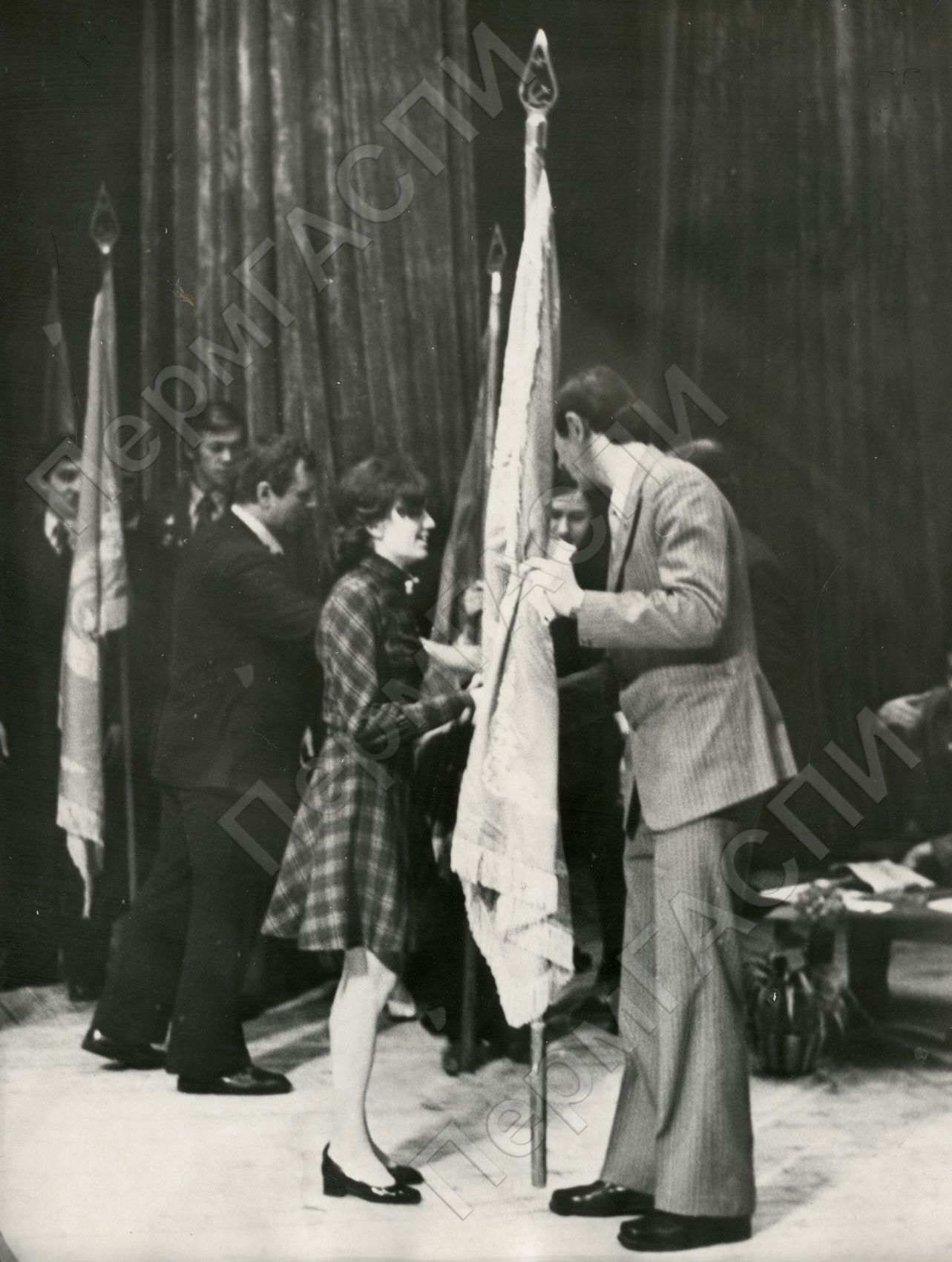 Мотовилихинский РК ВЛКСМ. Слет молодых гвардейцев пятилетки. Первый секретарь РК ВЛКСМ Фомичев А.А вручает переходящее знамя Богатовой Н., секретарю комсомольской организации междугородней телефонной станции.
