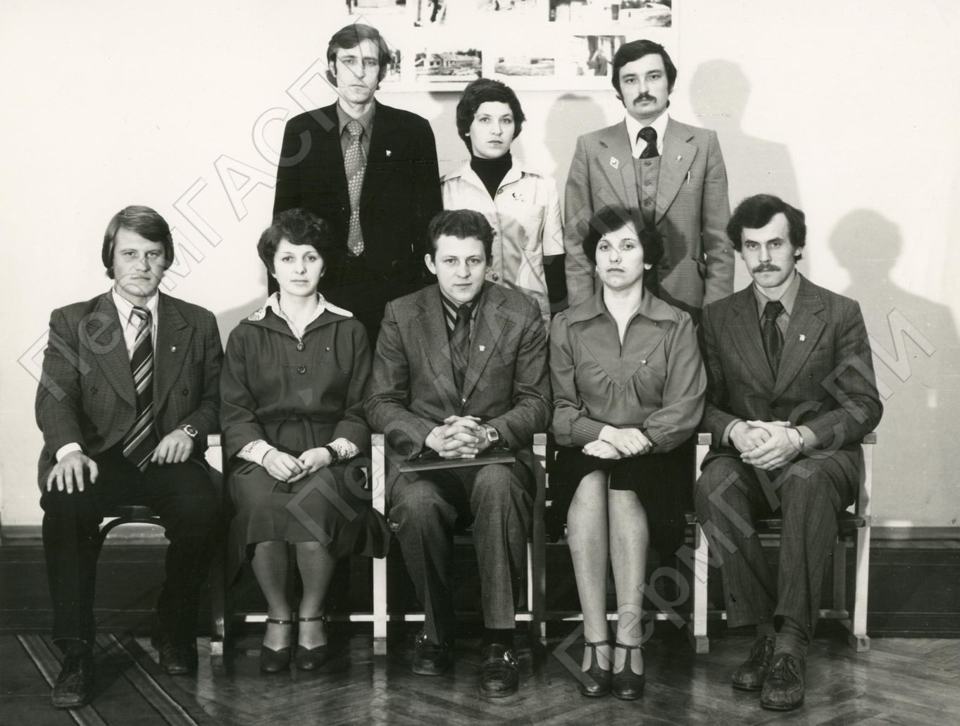 Мотовилихинский РК ВЛКСМ. работники райкома комсомола. Сидят: Куприянов С.Г. - 2-й секретарь, член бюро; Вотякова В.В. - секретарь по учащейся молодежи, член бюро; Буев А.В. - 1-й секретарь, член бюро; Архарова Н.С. - инструктор РК КПСС, бывший секретарь по учащейся молодежи(сентябрь 76 - сентябрь 79 гг.); Титов В.А. - секретарь комитета ВЛКСМ производственного объединения "Искра", член бюро. Стоят: Зайцев А.Г. - секретарь комитета ВЛКСМ завода имени В.И.Ленина, член бюро; Окулова О.А. - заведующая сектором учета РК ВЛКСМ, Булдашов С.Н. - заведующий организационным отделом РК ВЛКСМ, член бюро.