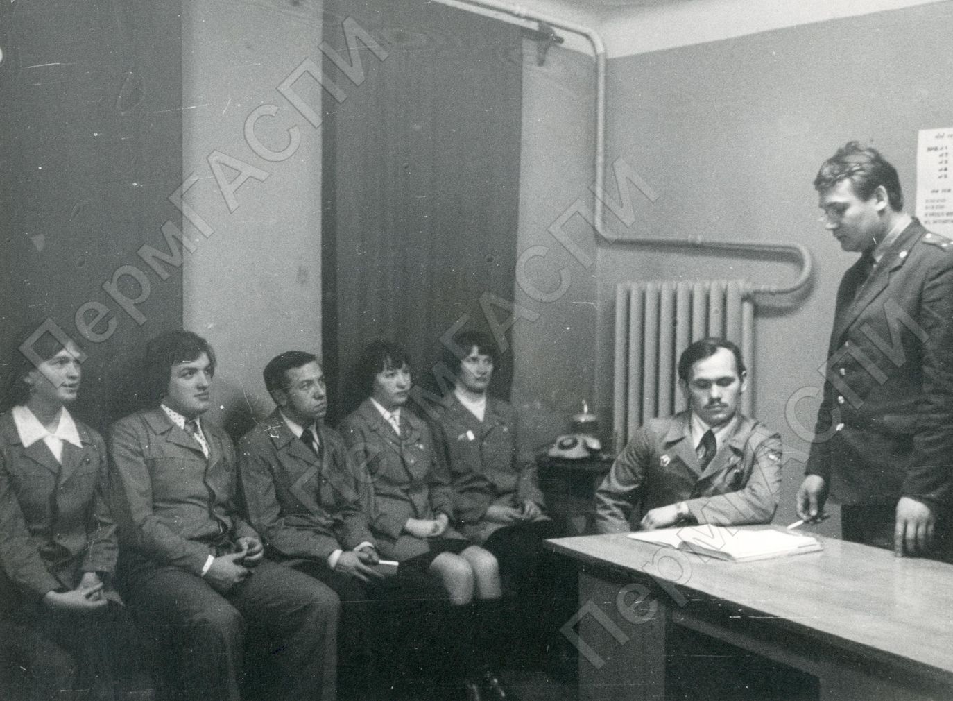 Машиностроительный завод имени В.И.Ленина. Заседание штаба оперативного комсомольского отряда. Командир отряда - Есин А., член КПИ, электрик цеха №9, сидит слева у стола.