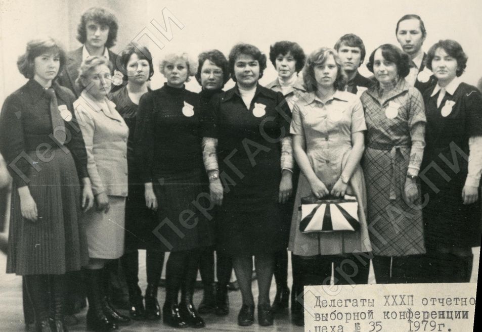 Делегаты 32-й отчено-выборной конференции цеха №35 завода имени Ф.Э. Дзержинского, первая слева - секретарь комсомольской организации цеха №35 Мусорова М.