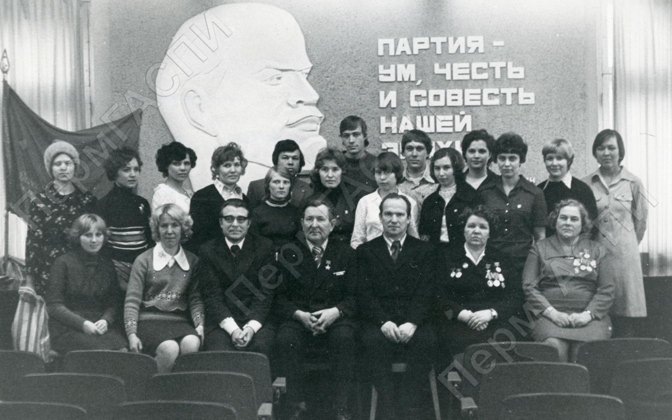 Победители соревнования за право подписать рапорт в честь 60-летия ВЛКСМ, завод им. Ф.Э. Дзержинского. 1-й ряд: 2)Шмотова З.Я. 3) Гришин В.Д. 5)Безматерных И.П. 2-й ряд: 5) Караваев В. 15) Лубнина В.И.