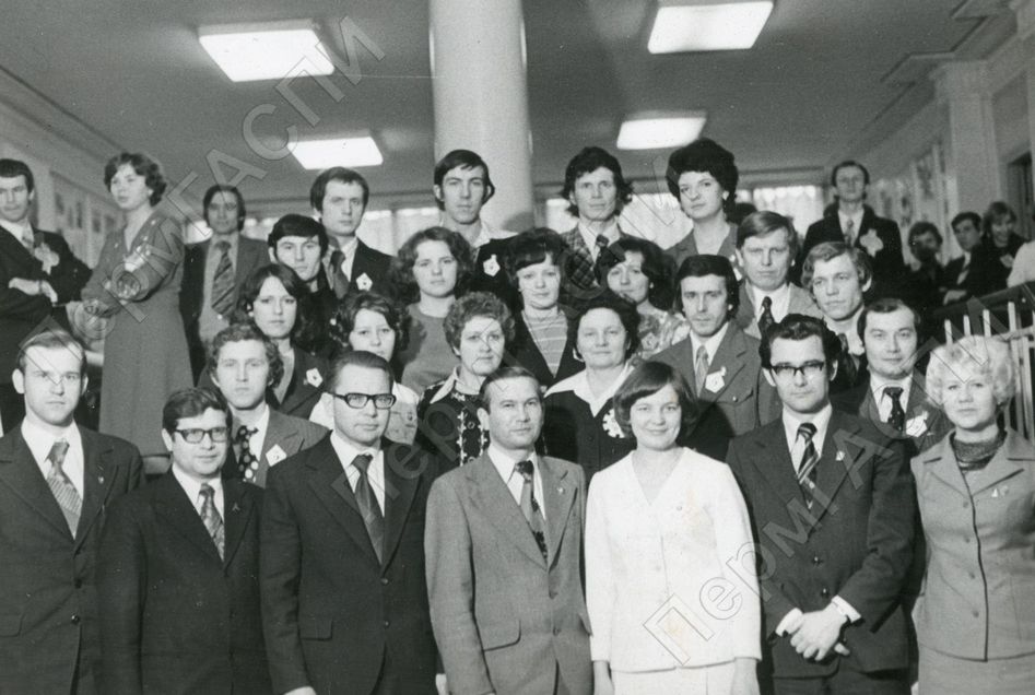 Делегаты 23-й городской отчетно-выборной комсомольской конференции от Березниковского азотно-тукового завода. 1-й ряд: 1) Яковлев О.Н. - 1-й секретарь ГК ВЛКСМ 2)Зубарев В.Д. - председатель горисполкома 3)Головнин А.Н. - 1-й секретарь ГК КПСС 5)Опишева Л.В. - аппаратчик, член ЦК ВЛКСМ, делегат 6)Ермолов В.М. - 1-й секретарь ОК ВЛКСМ 7)Вострецова В. - секретарь ГК ВЛКСМ. 2-й ряд: 1)Сальников В. - мастер, член комитета ВЛКСМ 2)Фирсова Т. - аппаратчик, член комитета ВЛКСМ 3) Носова Л. - электромонтер, член комитета ВЛКСМ 4) Охбаржевская О.В. - секретарь ГК КПСС 5)Лапеньков В. - секретарь комитета ВЛКСМ 6)Гибадуллин В. - механик, председатель ревкомисии ГК ВЛКСМ. 3-й ряд: 1)Заруба Н. - экономист, член комитета ВЛКСМ 2)Шаймарранов И. - слесарь, член комитета ВЛКСМ 3)Корнева Г. - лаборант, член комитета ВЛКСМ 4)Шумкова Р. - аппаратчик, член комитета ВЛКСМ 5)Журавлева Т. - оператор, член комитета ВЛКСМ 6)Пономарев Н. - электромонтер, член комитета ВЛКСМ 7)Гризнев С. нач.смены, член комитета ВЛКСМ. 4-й ряд: 1)Комлев Ю. - аппаратчик, член комитета ВЛКСМ 2)Груздев В. - мастер, председатель штаба комсомольского патруля 3) Язев А. - слесарь отдела контрольно-измерительных приборов и аппаратуры, член комитета ВЛКСМ 4)Калабина Л. - аппаратчик, член комитета ВЛКСМ.