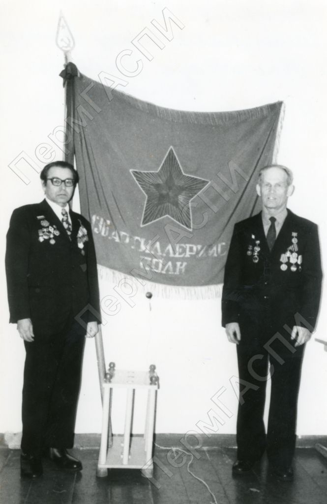 Ветераны Великой Отечественной войны Самосушев В.П. и Молоковских Г.В. у Боевого Красного Знамени. Усольский РК ВЛКСМ