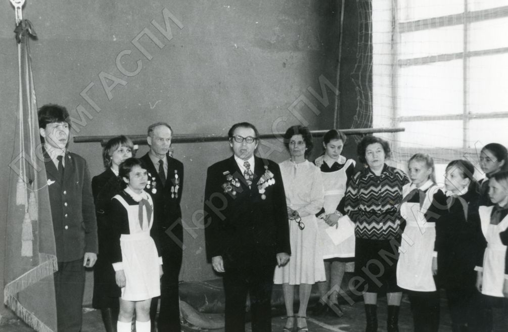 На митинге, посвященном встрече Боевого Квасного Знамени, в Орлинской средней школе Усольского района выступает участник Великой Отечественной войны Самосушев В.П.
