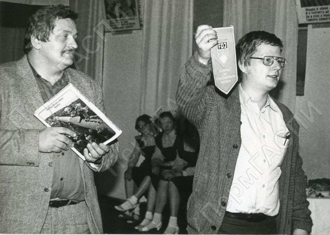 Уполномоченный Центрального Совета ССНМ на Пермском участке строительства газопровода (ГДР) Штефан Шуберт вручает памятный вымпел ССНМ и сувенир комсомольской организации колхоза "Октябрь" Березовского района на встрече немецкой и советской молодежи