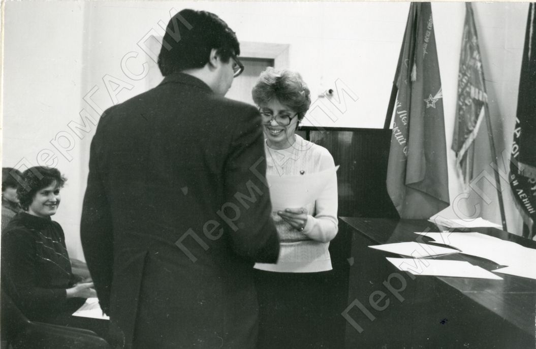 Первый секретарь Ленинского РК ВЛКСМ г. Березники Миронова Е. А. вручает свидетельство о подписании рапорта повару комбината № 1 Мурсалову Игорю