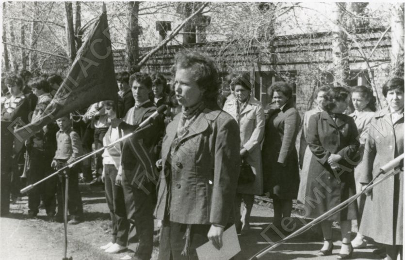 Торжественная линейка в Чайковском политехническом техникуме, посвященная Дню Победы. Выступает инструктор горкома КПСС Беркутова Т.В.