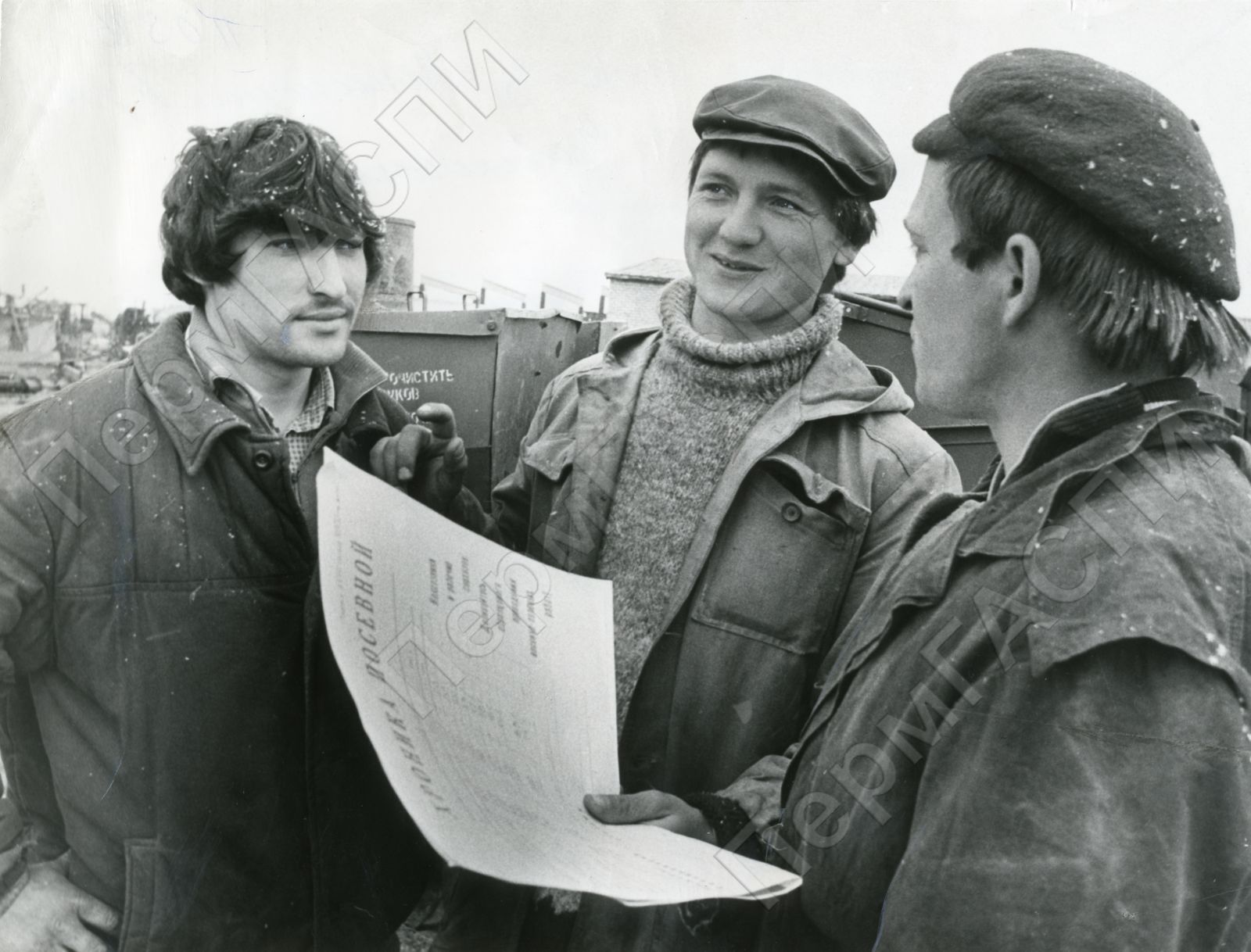 Члены комплексной комсомольско-молодежной бригады колхоза "Ленинский путь" Чайковского района, Н. Корнилов, секретарь комитета ВЛКСМ Ю. Зайцев и В. Шабаров