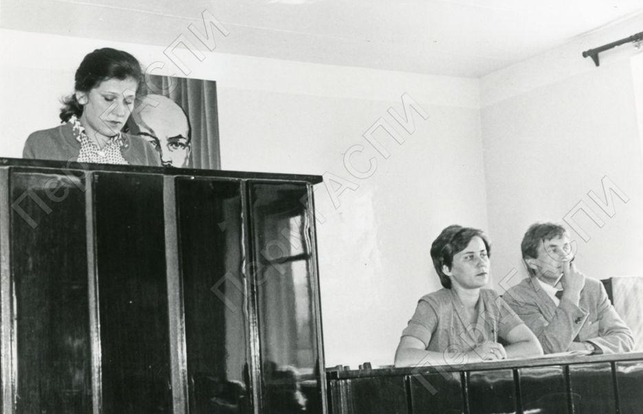 Выступает секретарь Комсомольской организации общепита Тараканова Н. на комсомольском собрании организаций торговли и сферы обслуживания