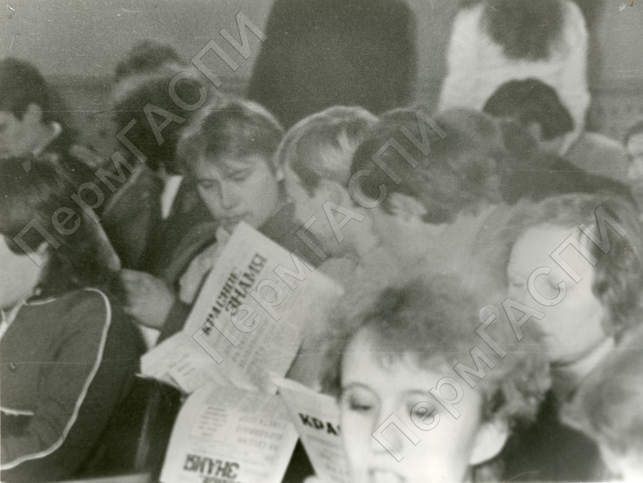 Делегаты перед открытием XXVI отчетно-выборной комсомольской конференции (районный Дом культуры)
