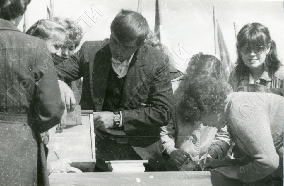 Референдум "Я голосую за мир". В центре Репин С. - секретарь комсомольской организации "Сельхозхимия", член Усольского райкома КПСС и ВЛКСМ. Усольский городской стадион