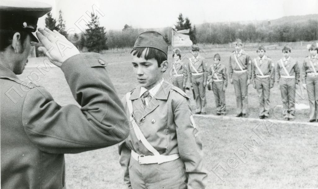 Пионерская игра "Зарница". Рапорт сдает ученик Рождественской средней школы пионер Баталов Сергей работнику райвоенкомата Смолину А.В.