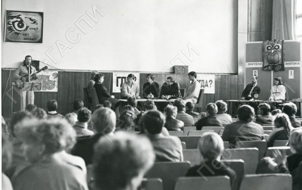 Музыкальная пауза в викторине "Что? Где? Когда?". У микрофона Минуллин Александр, за столом шестерка прядильной Фабрики № 2. Чайковский комбинат шелковых тканей