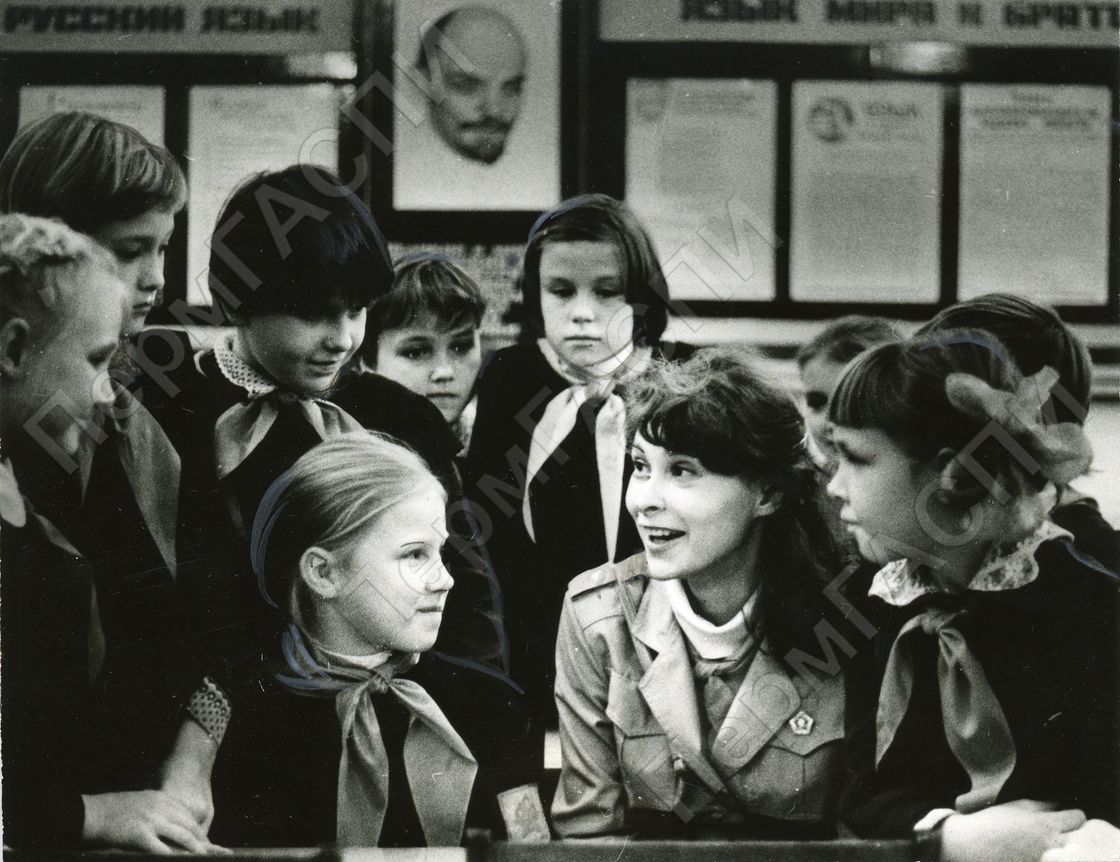 Делегат XIX съезда ВЛКСМ старшая пионервожатая Губахинской школы № 20. Людмила Шакирова с пионерами.