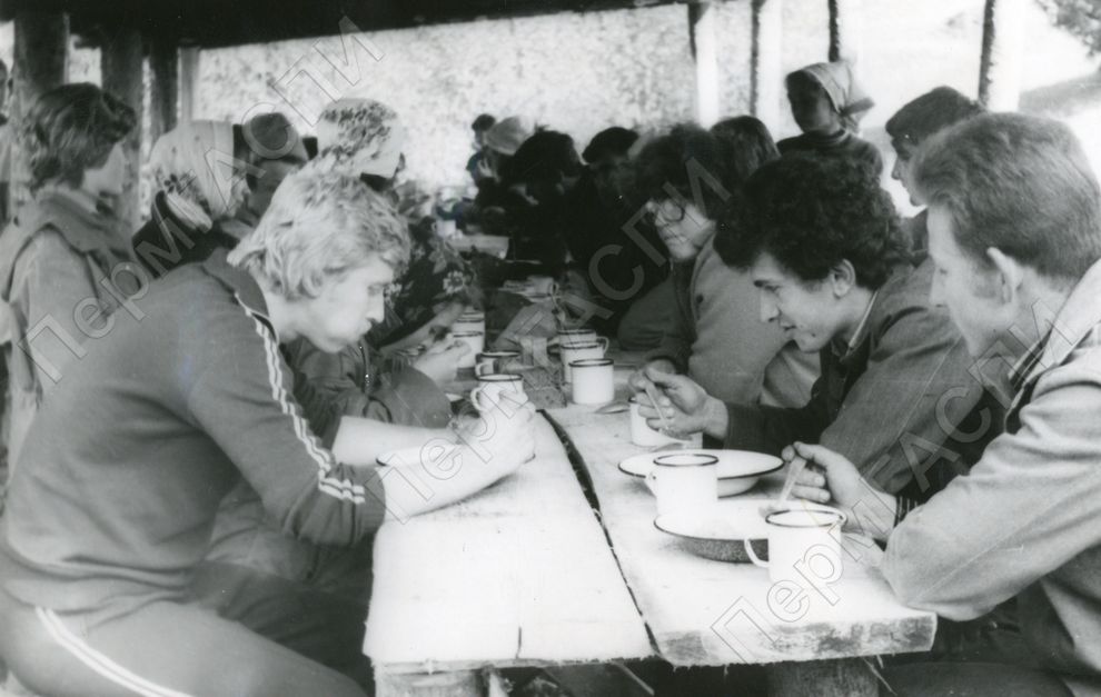 Студенты исторического факультета университета на сельхозработах во время обеда