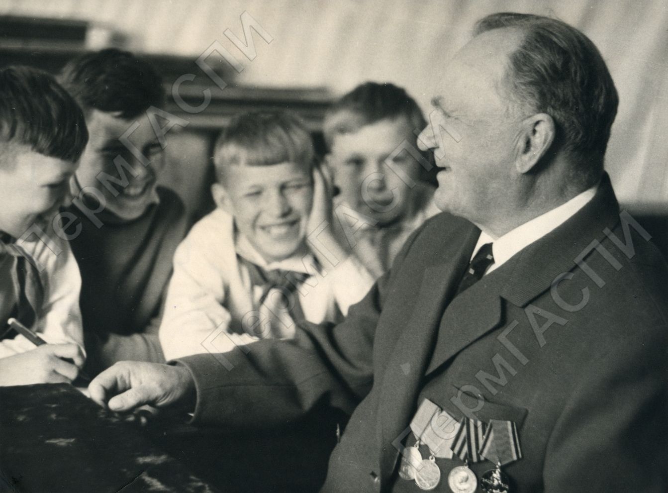 Пионеры на встрече с встречавшим В. И. Ленина Филатовым Александором Михайловичем.