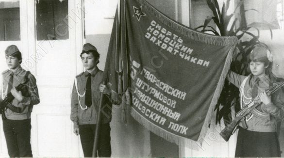 Почетный караул у Знамени 155 авиационного полка на митинге в Оханской средней школы