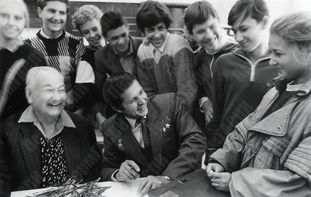 Эта часть выставки посвящена посещению нашего региона космонавтом В.П. Савиных. В 1957-1960 гг. Виктор Петрович учился в Пермском техникуме железнодорожного транспорта. Впоследствии он окончил Московский институт инженеров геодезии, аэрофотосъёмки и картографии, был зачислен в отряд космонавтов, неоднократно лично участвовал в космических полетах. Дважды - в 1981 г. и в 1985 г. - В.П. Савиных был награжден Золотой Звездой Героя Советского Союза. В 1981 г. Виктор Петрович посетил г. Пермь с официальным визитом, во время которого он принял участие в праздновании 100-летия Пермского техникума железнодорожного транспорта. На торжественном собрании, посвященном этому юбилею, состоявшемся во Дворце культуры Пермского телефонного завода 20 ноября 1981 г., В.П. Савиных были вручены лента и удостоверение Почетного гражданина города Перми. С тех пор Виктор Петрович неоднократно приезжал в наш регион, встречался с учащейся молодежью и работниками промышленных предприятий, посещал учреждения культуры, давал интервью пермским журналистам. Фотографии, сделанные во время этих визитов, и составляют данный раздел выставки.