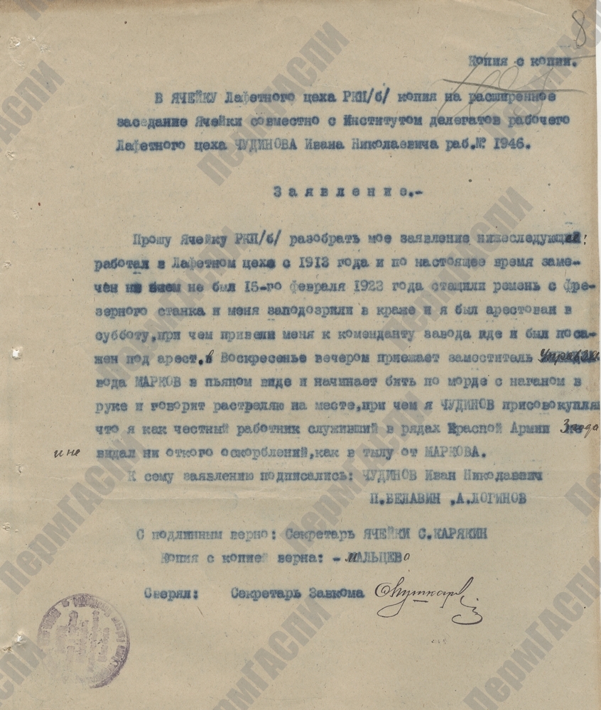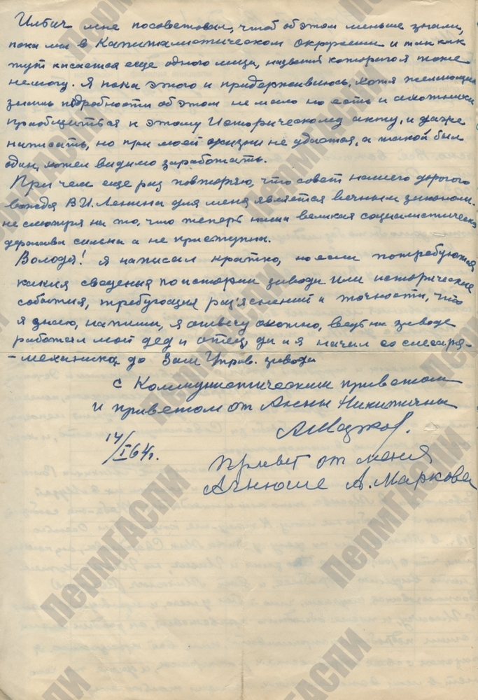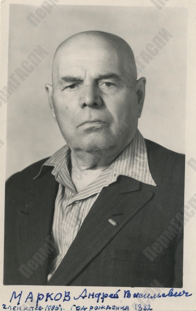 Марков Андрей Васильевич родился 31 августа 1882 г. в семье рабочего Мотовилихинского завода Пермского уезда Пермской губернии. Образование Андрей Васильевич получил в Пермском железнодорожном техническом училище, после окончания которого работал в Пермских железнодорожных мастерских, а затем стал машинистом на паровозе. В 1903 г. А.В. Марков был призван на службу в Российскую Императорскую Армию и отправлен в Манчжурию, откуда через год дезертировал. Вернувшись к родителям в Мотовилиху в 1904 г. Андрей Васильевич поступил слесарем на Мотовилихинский завод, где вскоре попал под влияние местных социал-демократов. В декабре 1905 г. А.В. Марков принял участие в вооруженном восстании в Мотовилихе, но к ответственности привлечен не был. В члены РСДРП Андрей Васильевич вступил в 1906 г. и вскоре стал одним из самых активных участников Мотовилихинской организации этой партии, занимаясь антиправительственной агитацией. За это в 1907 г. А.В. Марков был арестован и в 1908 г. отправлен в ссылку в г. Сольвычегодск Сольвычегодского уезда Вологодской губернии.