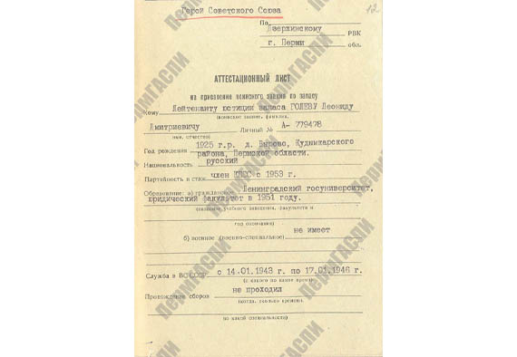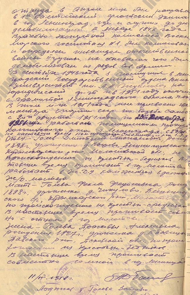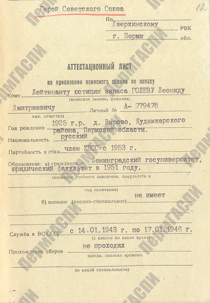 1 Отец – Голев Дмитрий Степанович (1898 г.р.), мать – Голева Фекла Федосиевна (1898 г.р.). Послужной список. Голев Леонид Дмитриевич. Личный № А – 779478. Составлен 11 апреля 1952 г. гор. Ленинград. Военное Министерство Союза ССР. [2. Л. 2 – 3].