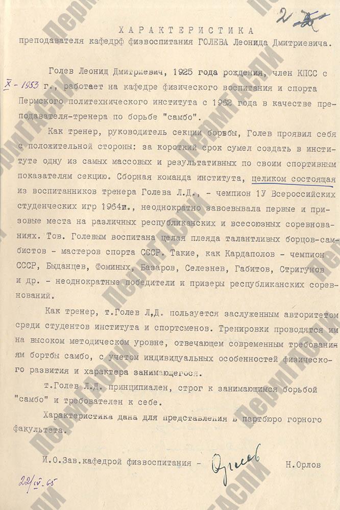 В характеристике для председателя и партбюро горного факультета 1965 г. отмечается, что «…Голев <…> за короткий срок сумел создать в институте одну из самых массовых и результативных по своим показателям секцию» 8.