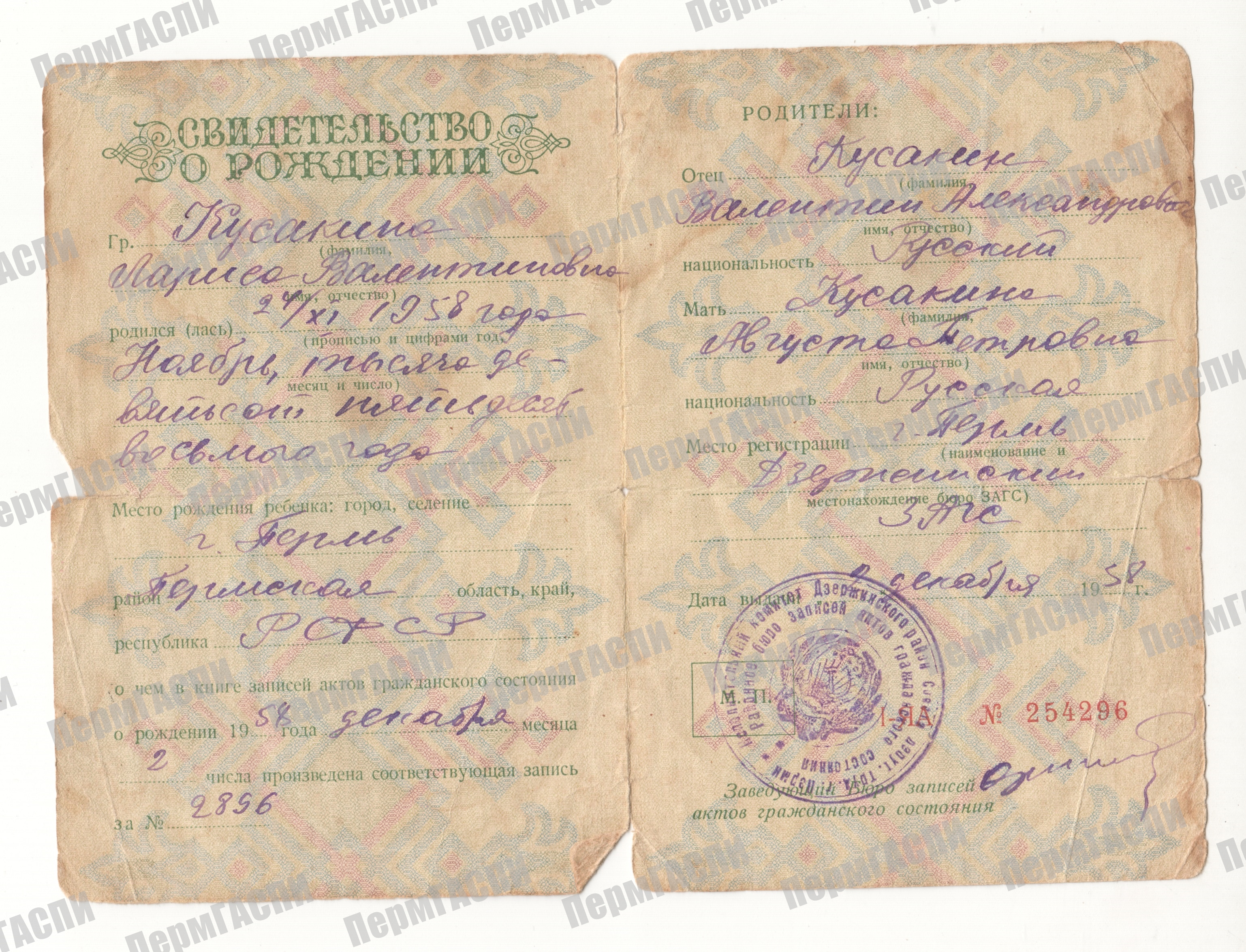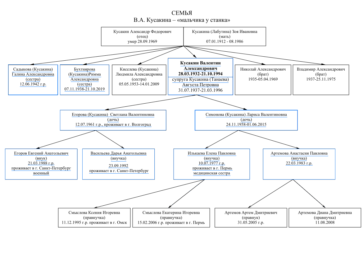 Жена Кусакина (Танаева) Августа Петровна (31 июля 1937 – 21 марта 1996).