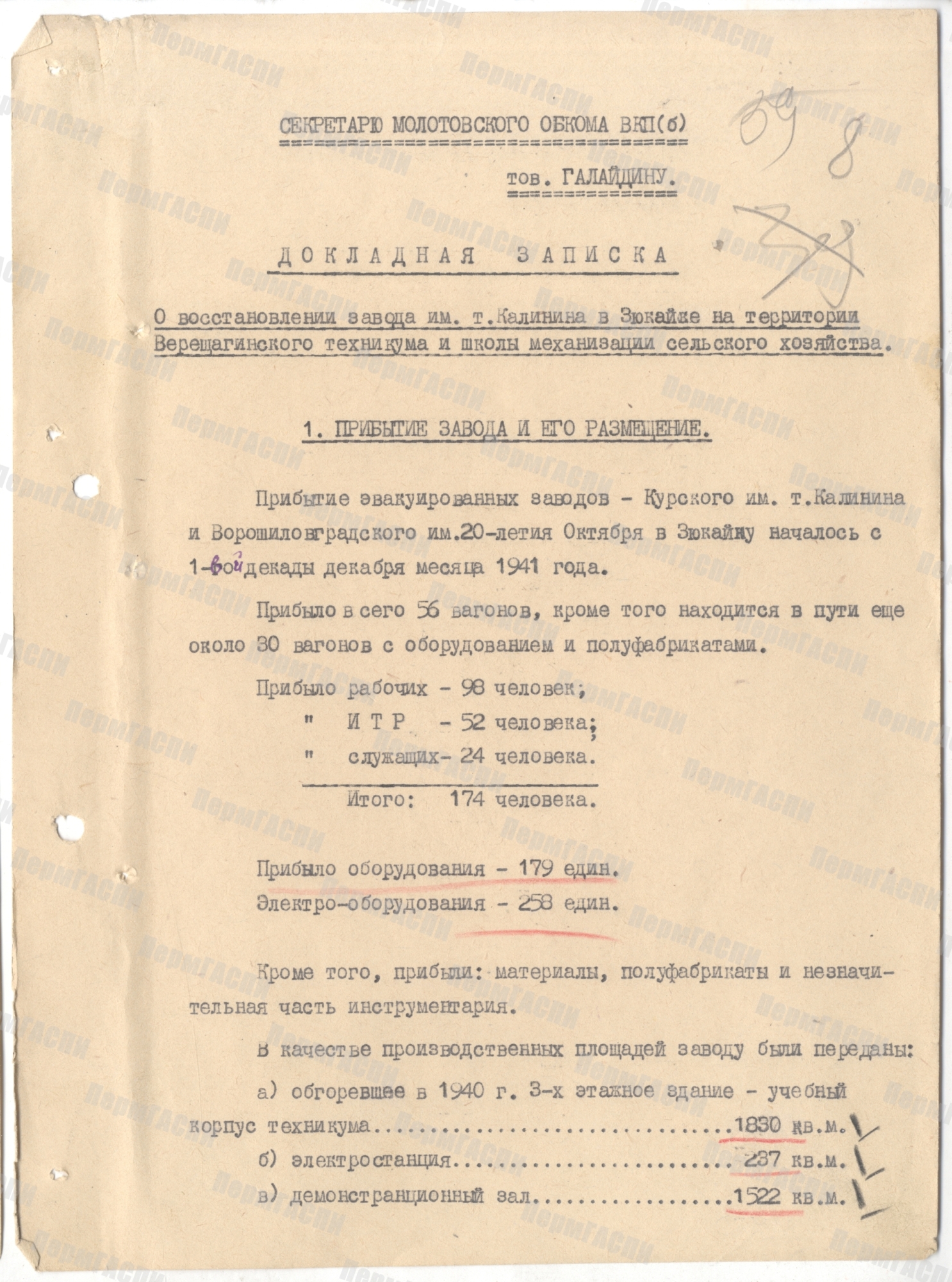 Фрагмент докладной записки «О восстановлении завода им. М.И. Калинина в Зюкайке на территории Верещагинского техникума и школы механизации сельского хозяйства». [Апрель 1942 г.]