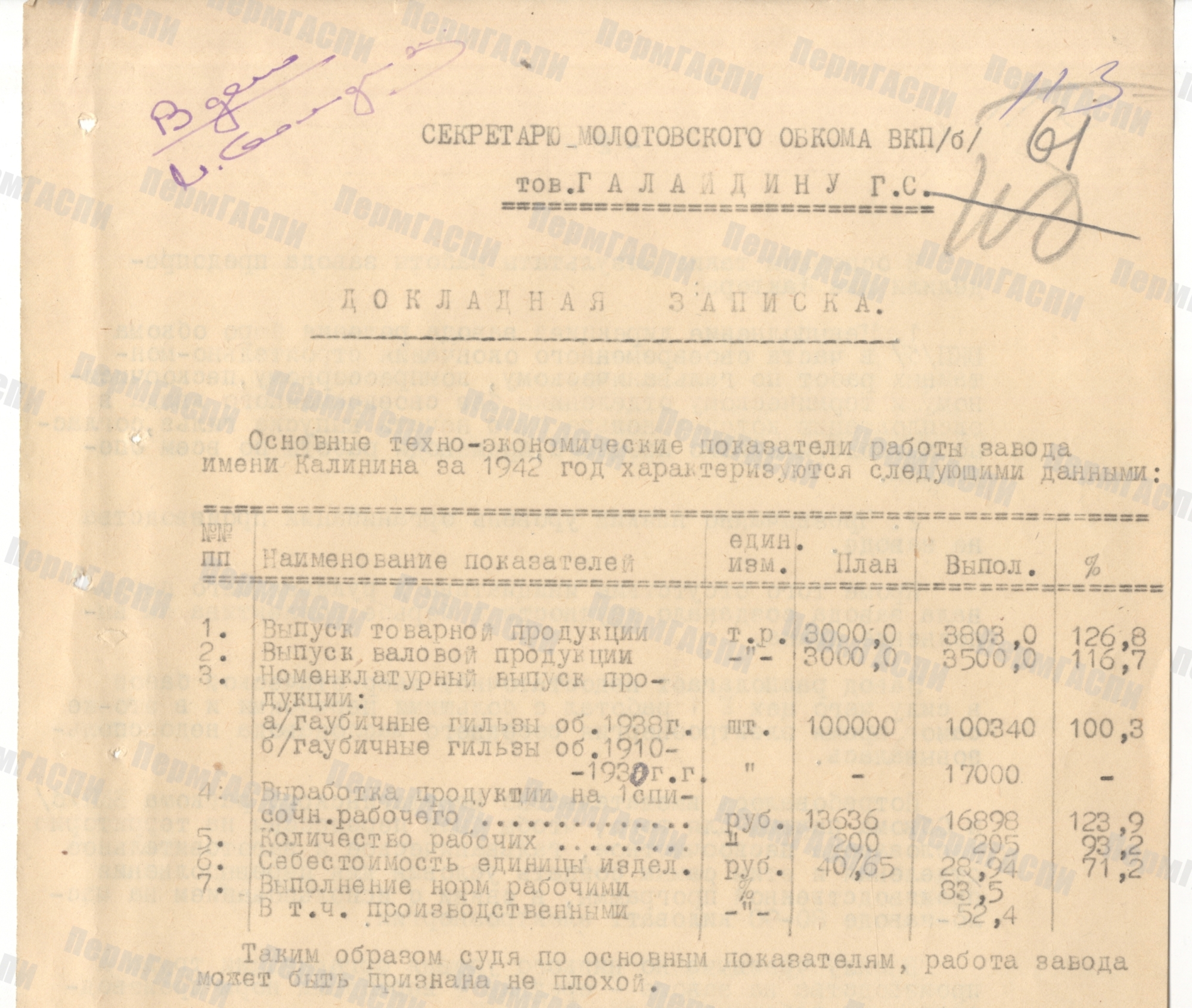Фрагмент докладной записки «Основные технико-экономические показатели работы завода им. М.И. Калинина за 1942 г.» [Не ранее февраля 1943 г.]