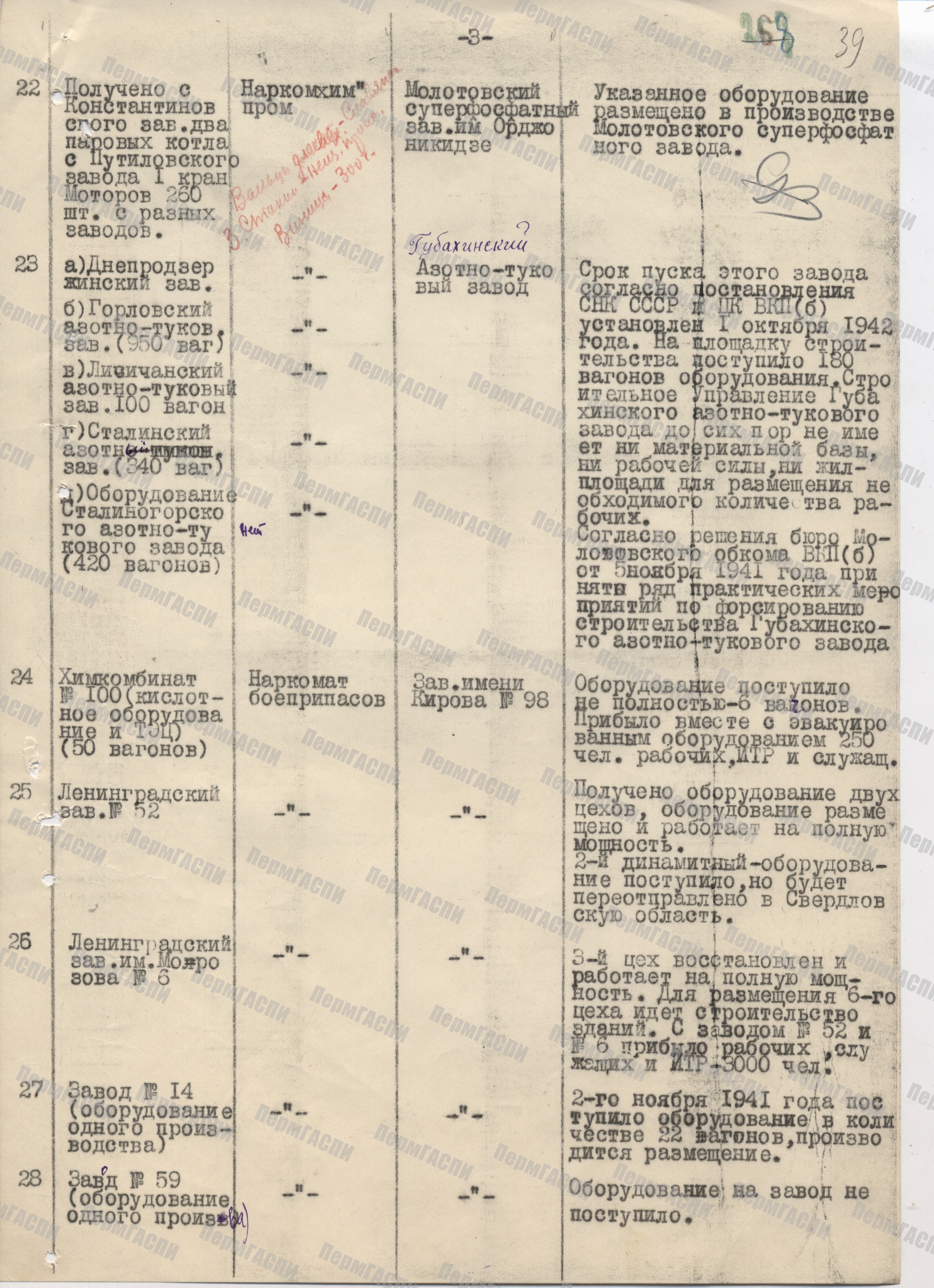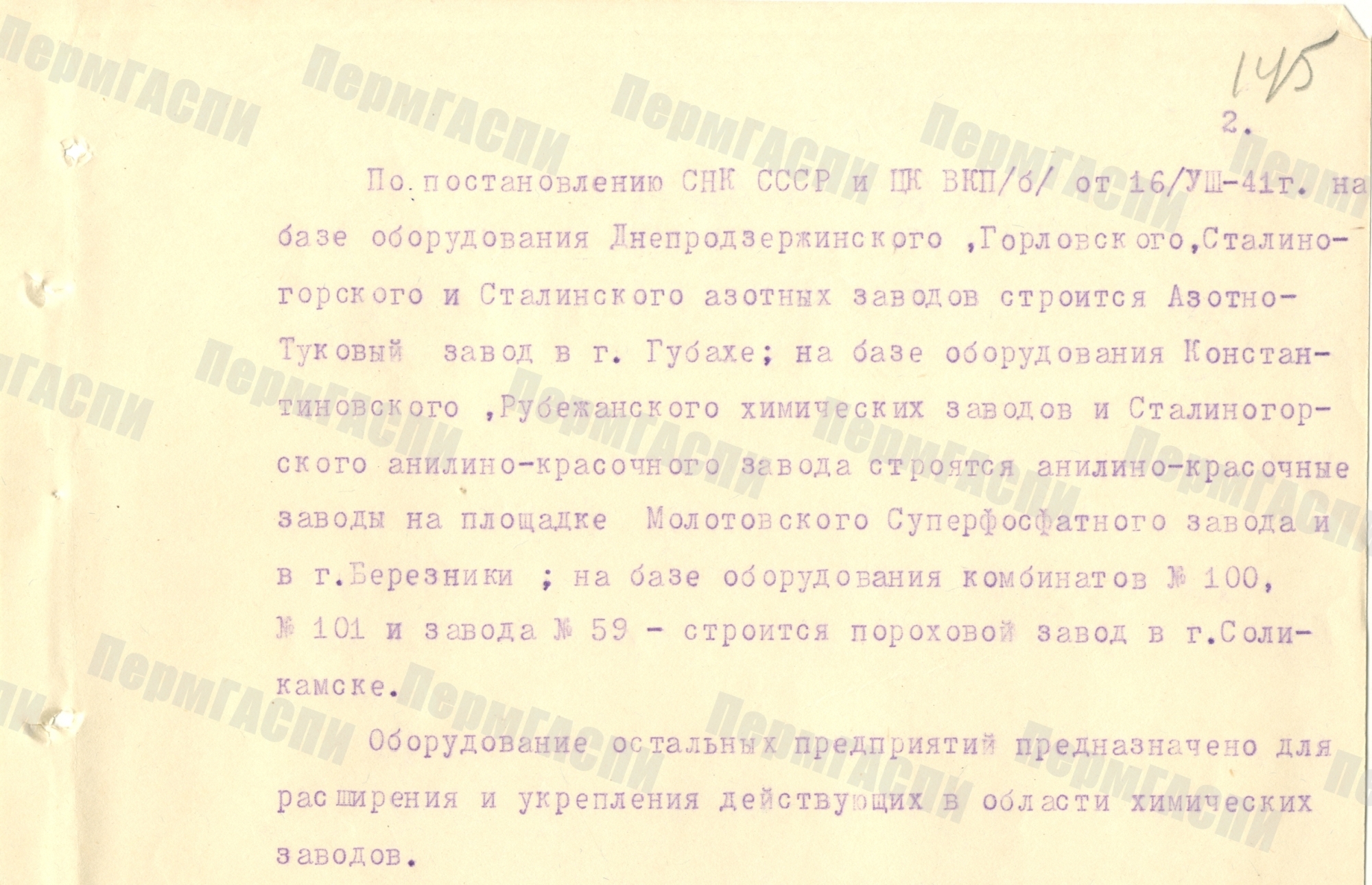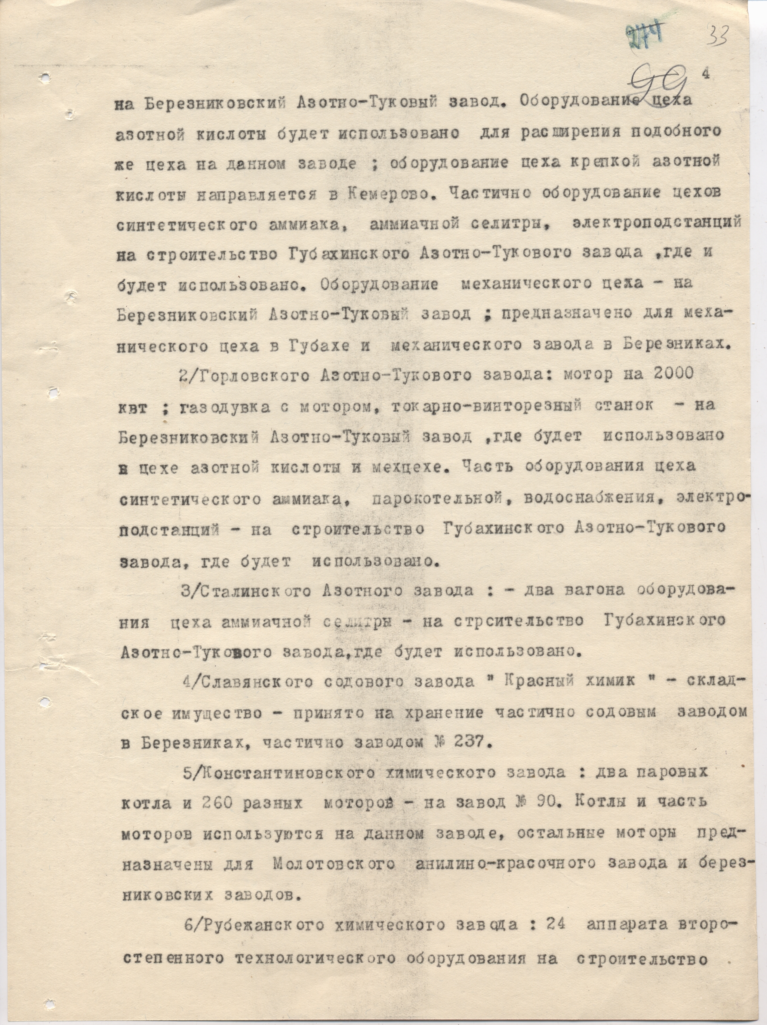 Фрагменты информационной записки о работе предприятий химической промышленности на территории Молотовской области , в которых имеется информация об использовании эвакуированного в г. Губаху и в г. Березники оборудования Лисичанского азотно-тукового завода (ныне – Северодонецкое объединение «Азот»). 25 ноября 1941 г. ПермГАСПИ. Ф.105. Оп.7. Д.387. Л.17, 21, 22, 26, 27"