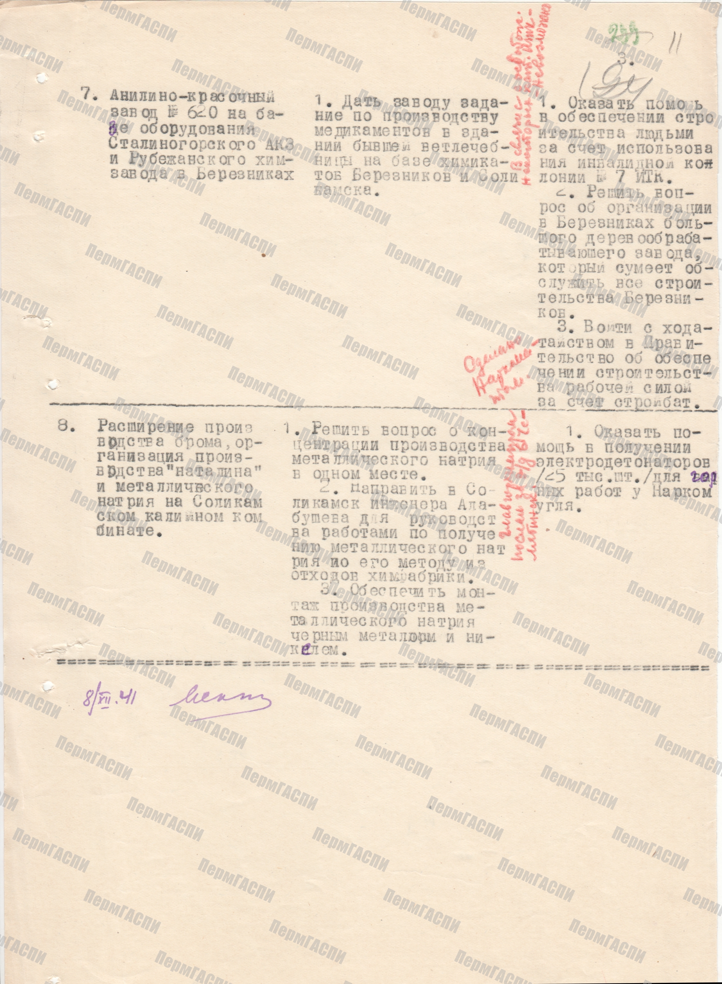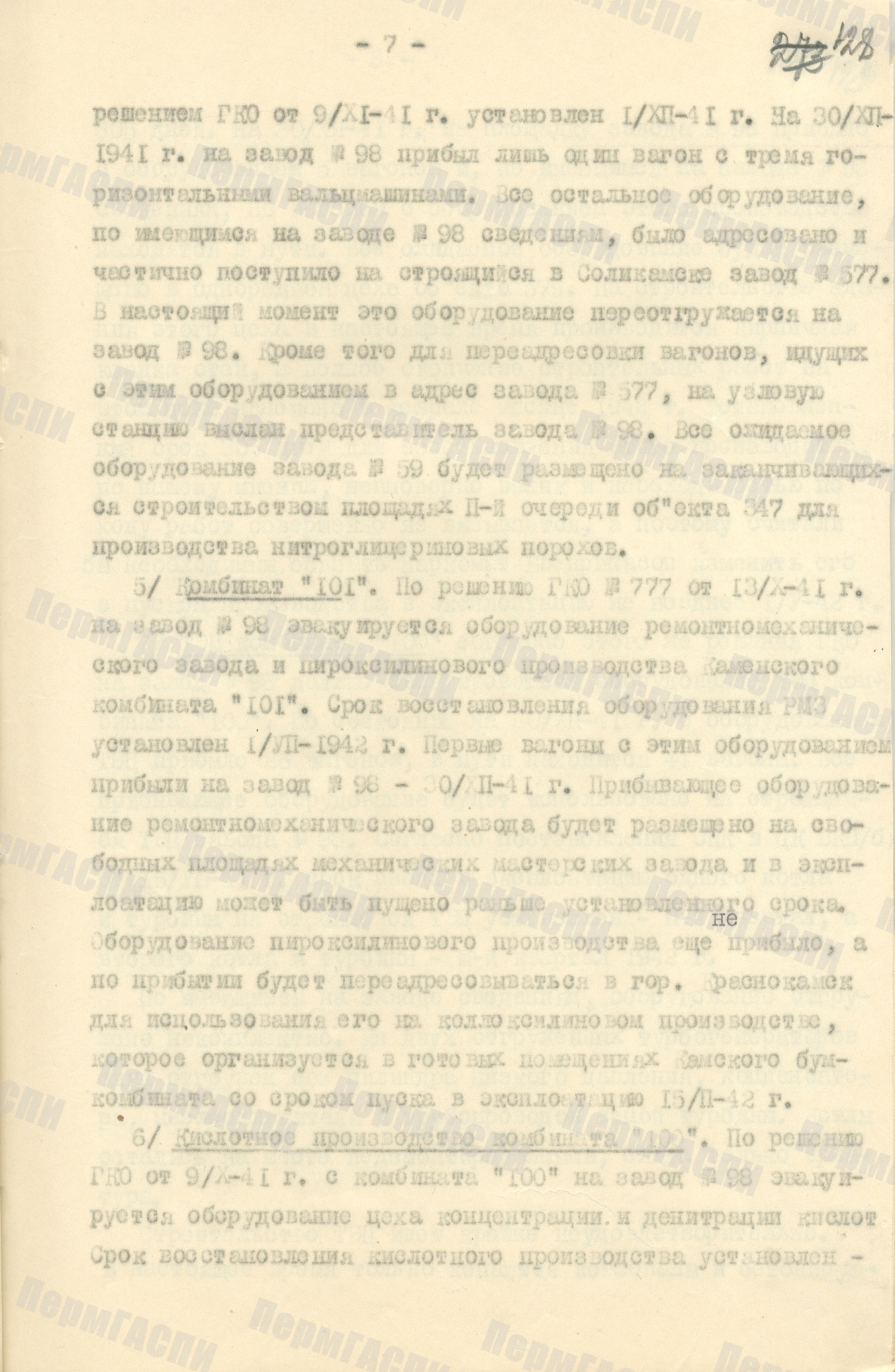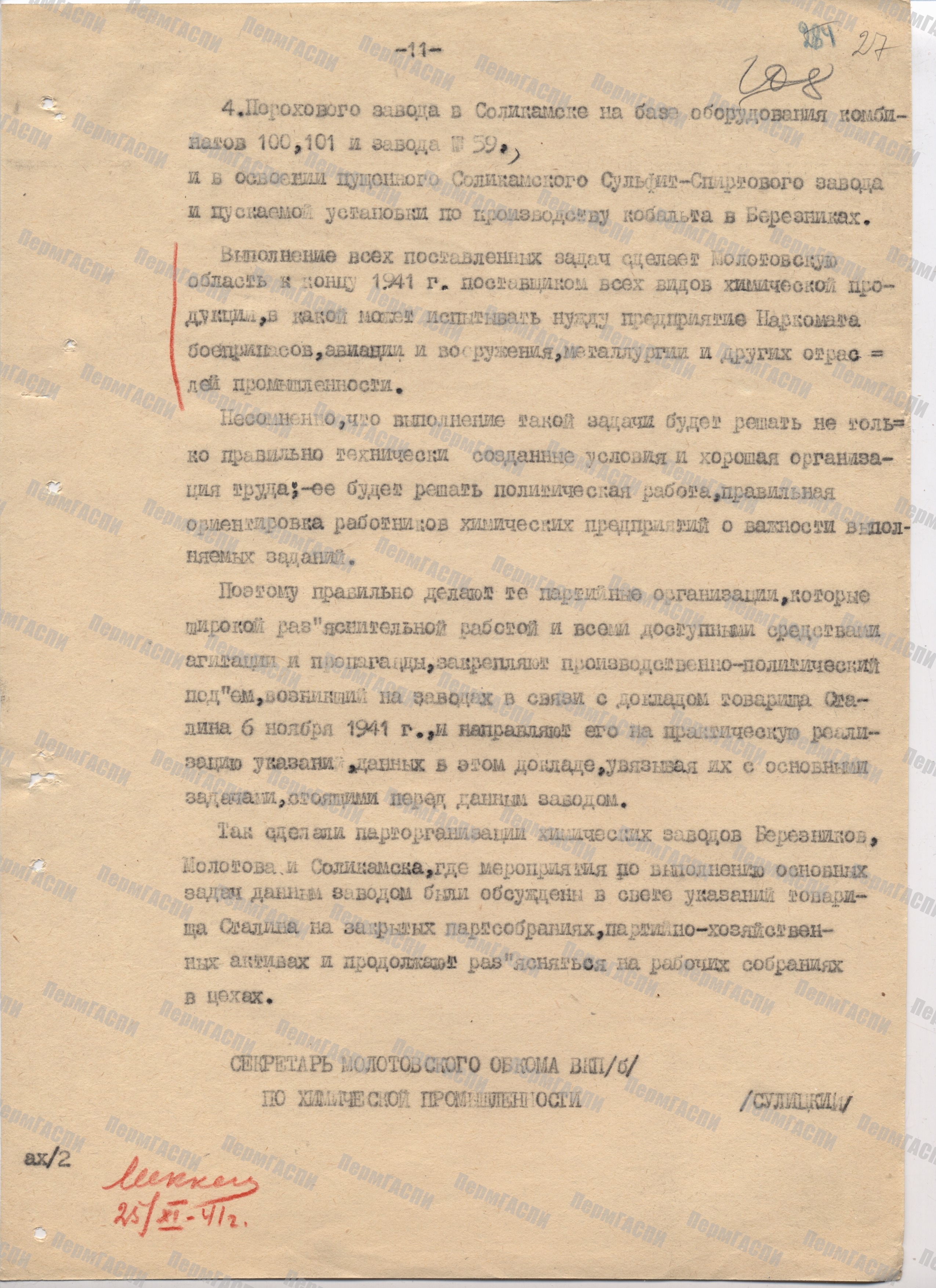 Фрагменты информационной записки о работе предприятий химической промышленности на территории Молотовской области , в которых имеется информация об использовании эвакуированного в г. Губаху и в г. Березники оборудования Лисичанского азотно-тукового завода (ныне – Северодонецкое объединение «Азот»). 25 ноября 1941 г. ПермГАСПИ. Ф.105. Оп.7. Д.387. Л.17, 21, 22, 26, 27"