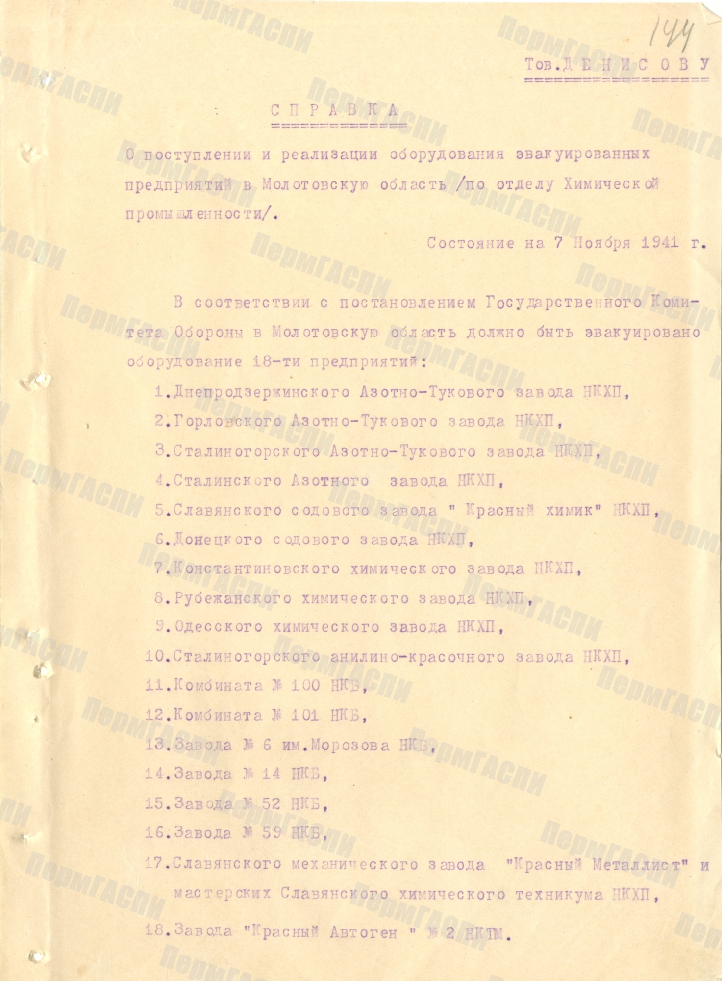 Справка о поступлении и использовании оборудования предприятий химической промышленности, эвакуированных из прифронтовой полосы на территорию Молотовской области, в которой имеется информация об оборудовании Лисичанского азотно-тукового завода (ныне – Северодонецкое объединение «Азот»). 9 ноября 1941 г. ПермГАСПИ. Ф.105. Оп.7. Д.387. Л.30-36