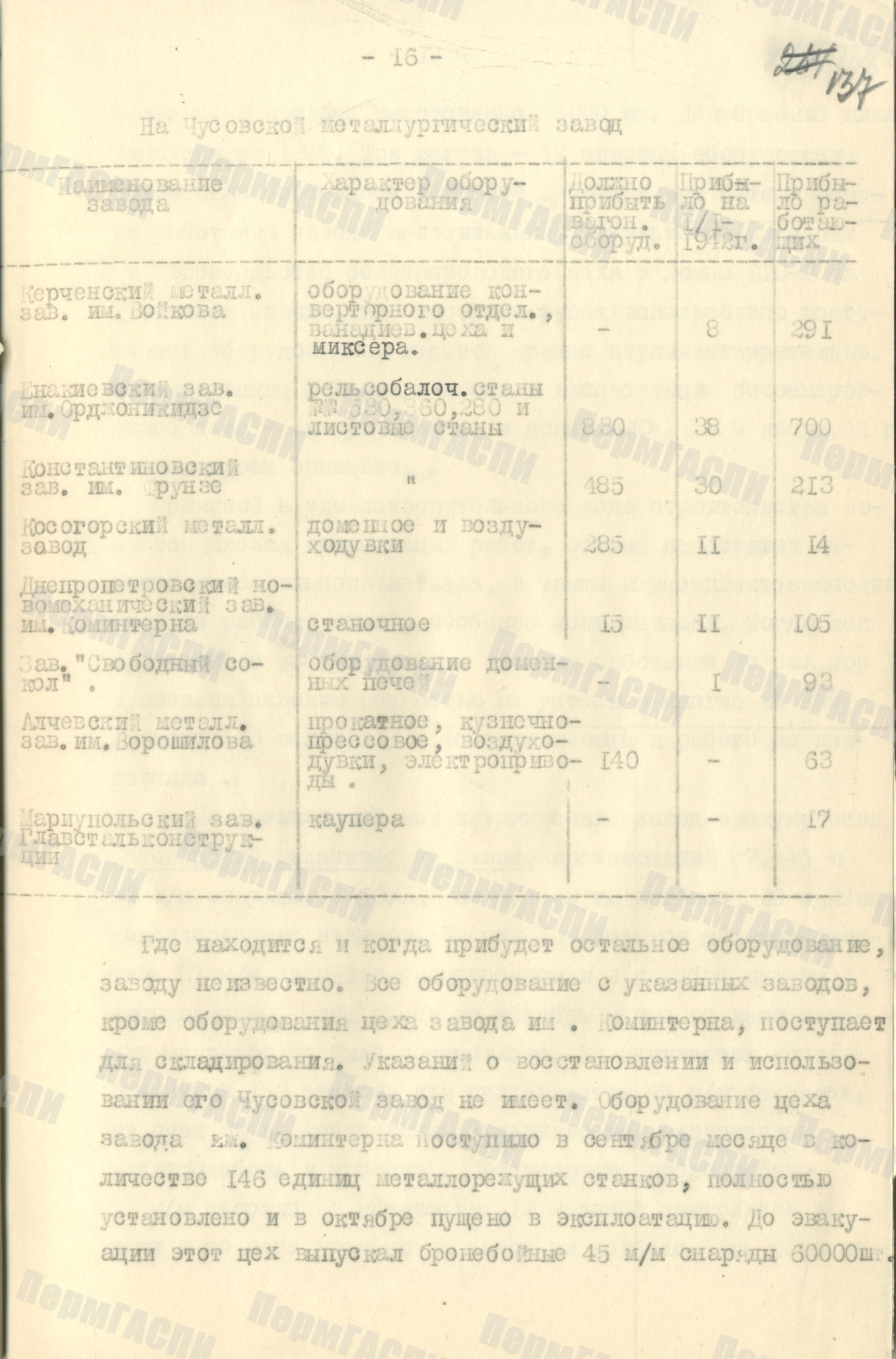 Фрагмент справки «О состоянии оборудования, эвакуированного на металлургические заводы Молотовской области».