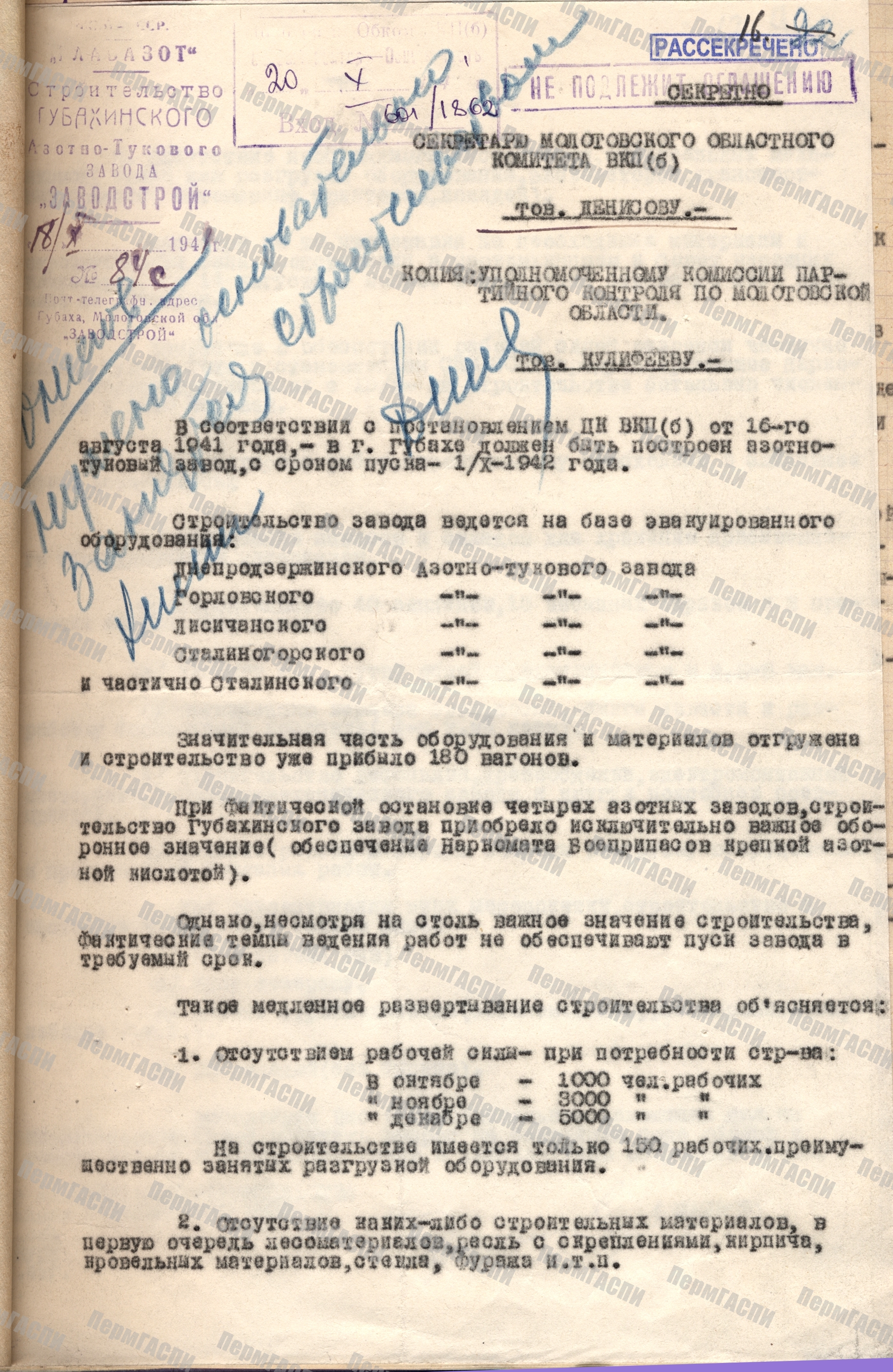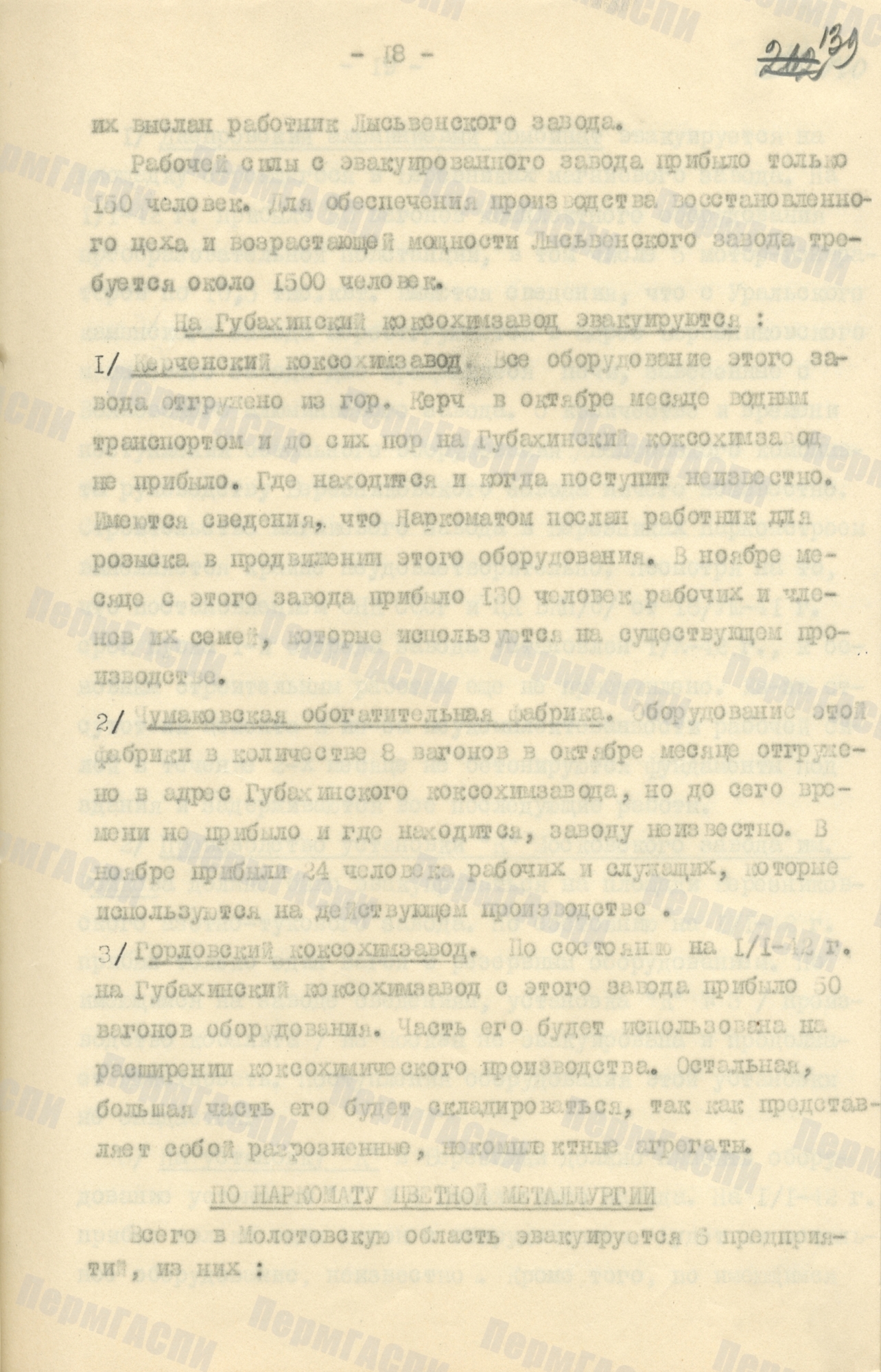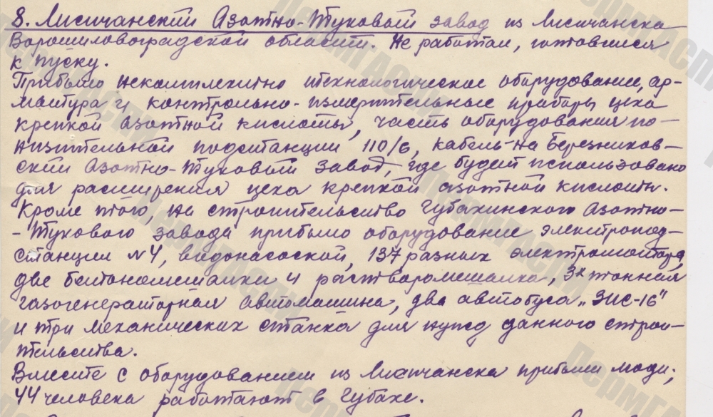 Информационная записка о строительстве Губахинского азотно-тукового завода, в которой имеются сведения о том, что на этом предприятии планируется использование эвакуированного в г. Губаху оборудования Лисичанского азотно-тукового завода (ныне – Северодонецкое объединение «Азот»). 18 октября 1941 г. ПермГАСПИ. Ф.105. Оп.7. Д.94. Л.16-17