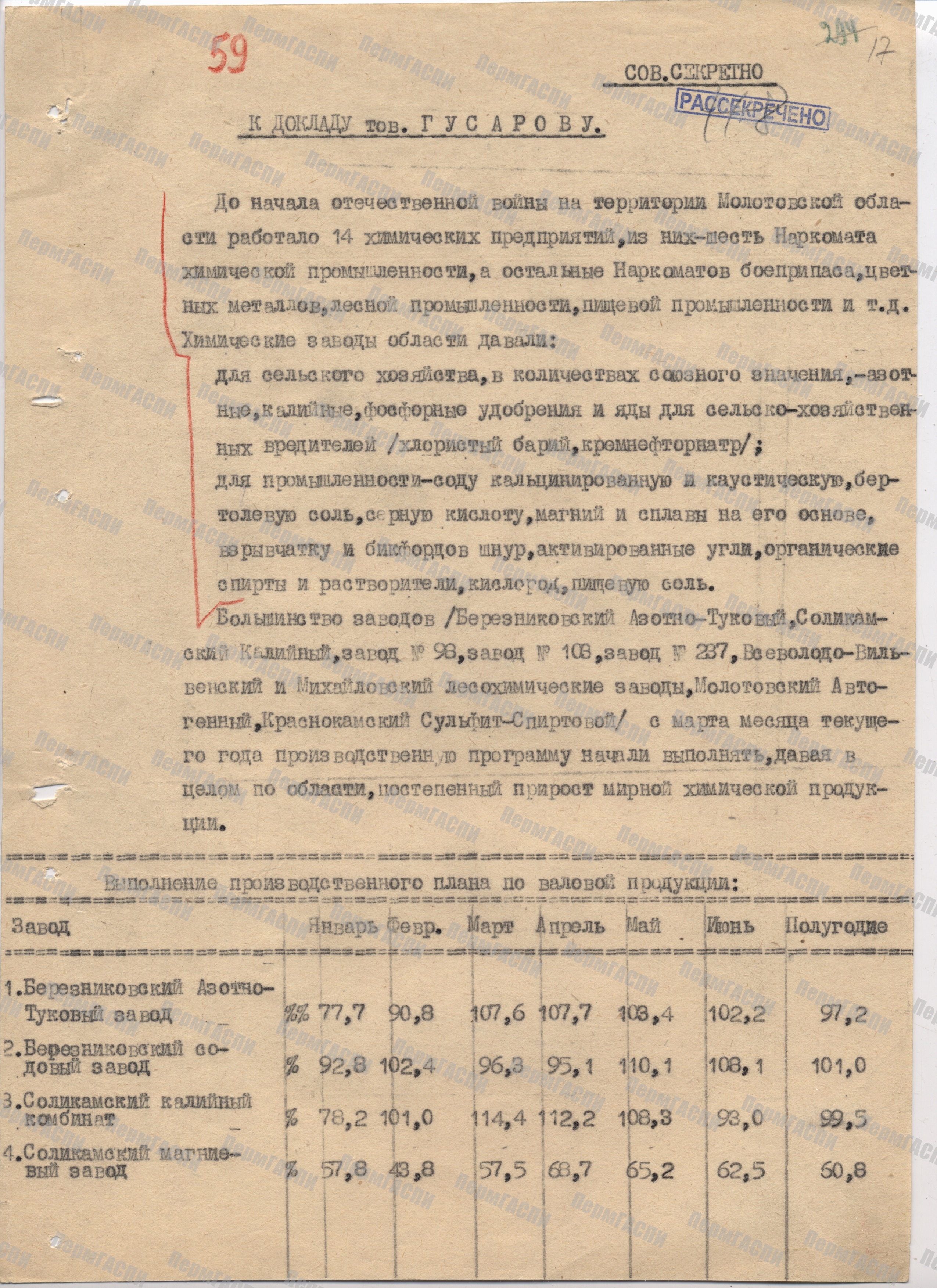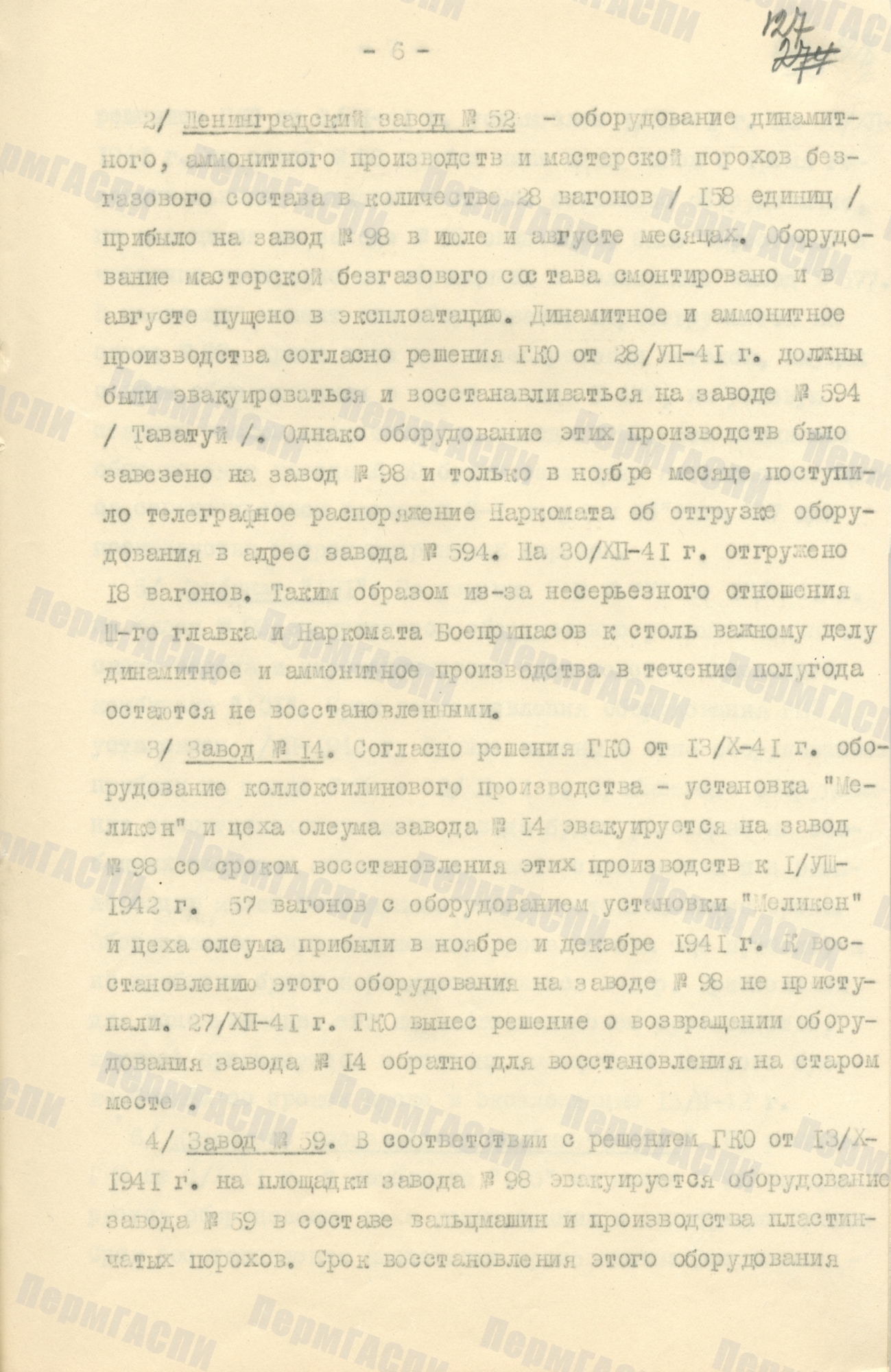 Фрагменты докладной записки о восстановлении заводов, эвакуированных из Донбасса в Молотовскую область, содержащие информацию об эвакуации Ворошиловградского порохового завода № 59 им. Петровского.