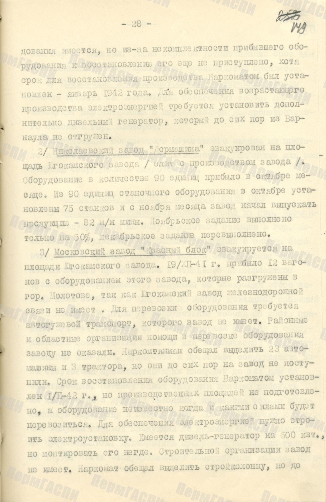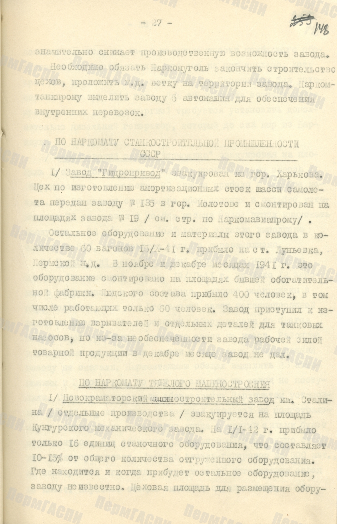 Фрагмент докладной записки о восстановлении производства Новокраматорского металлургического завода, эвакуированного в Молотовскую область. 15 января 1942 г. ПермГАСПИ. Ф. Оп. 8. Д. 97. Л. 148–149.