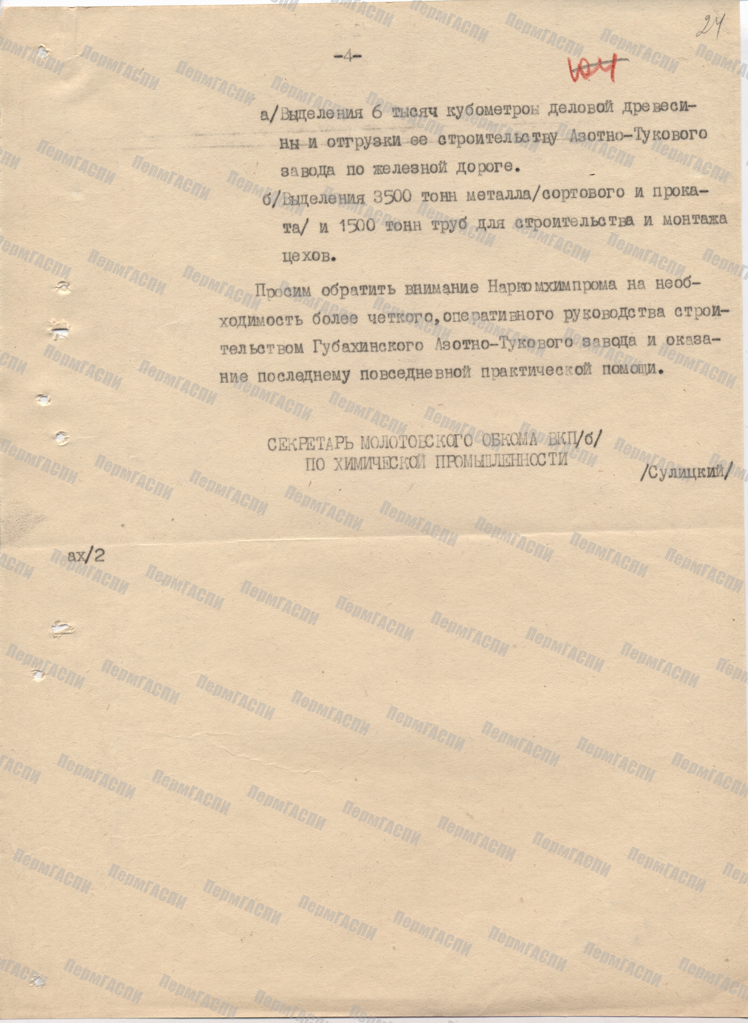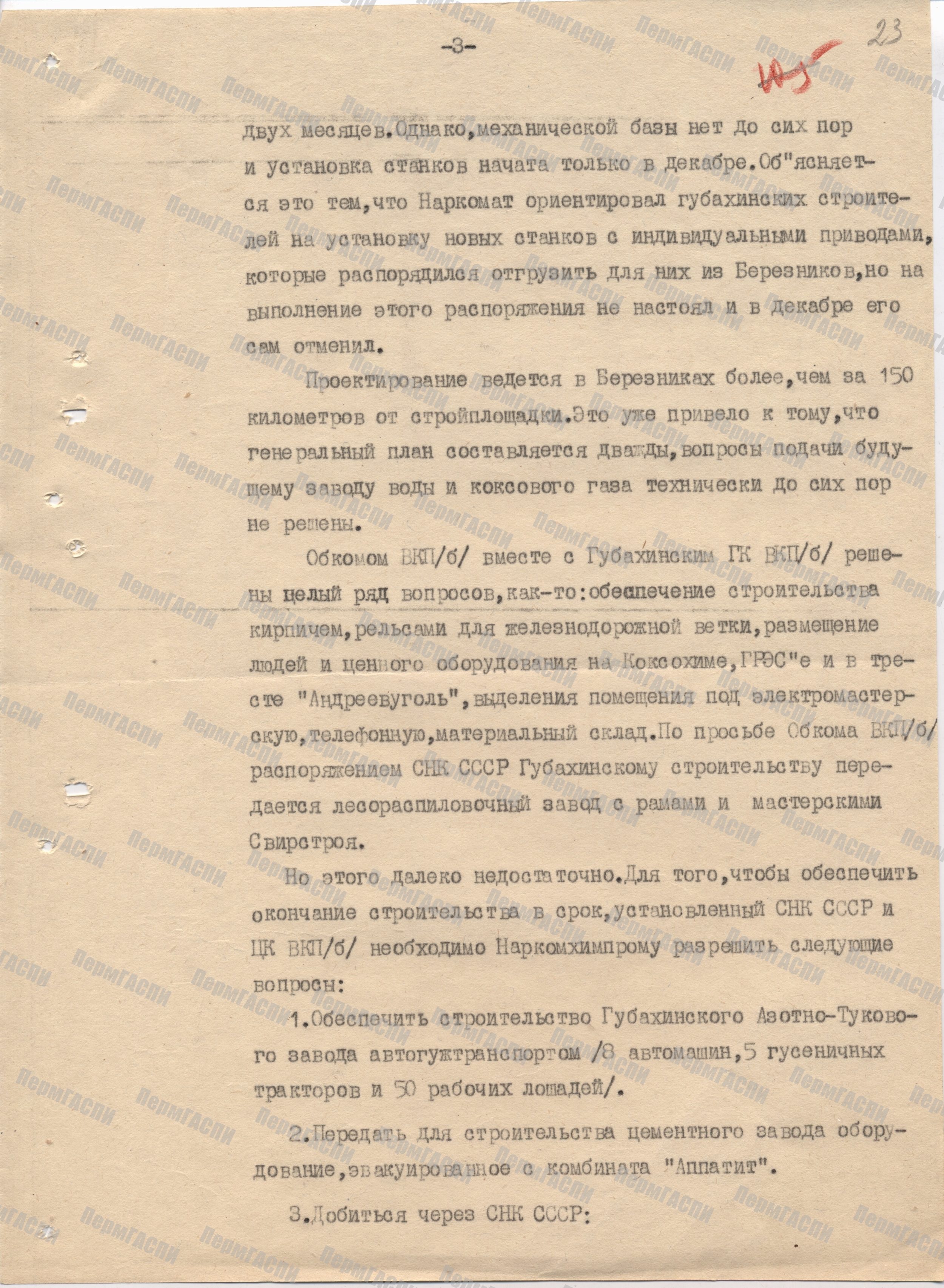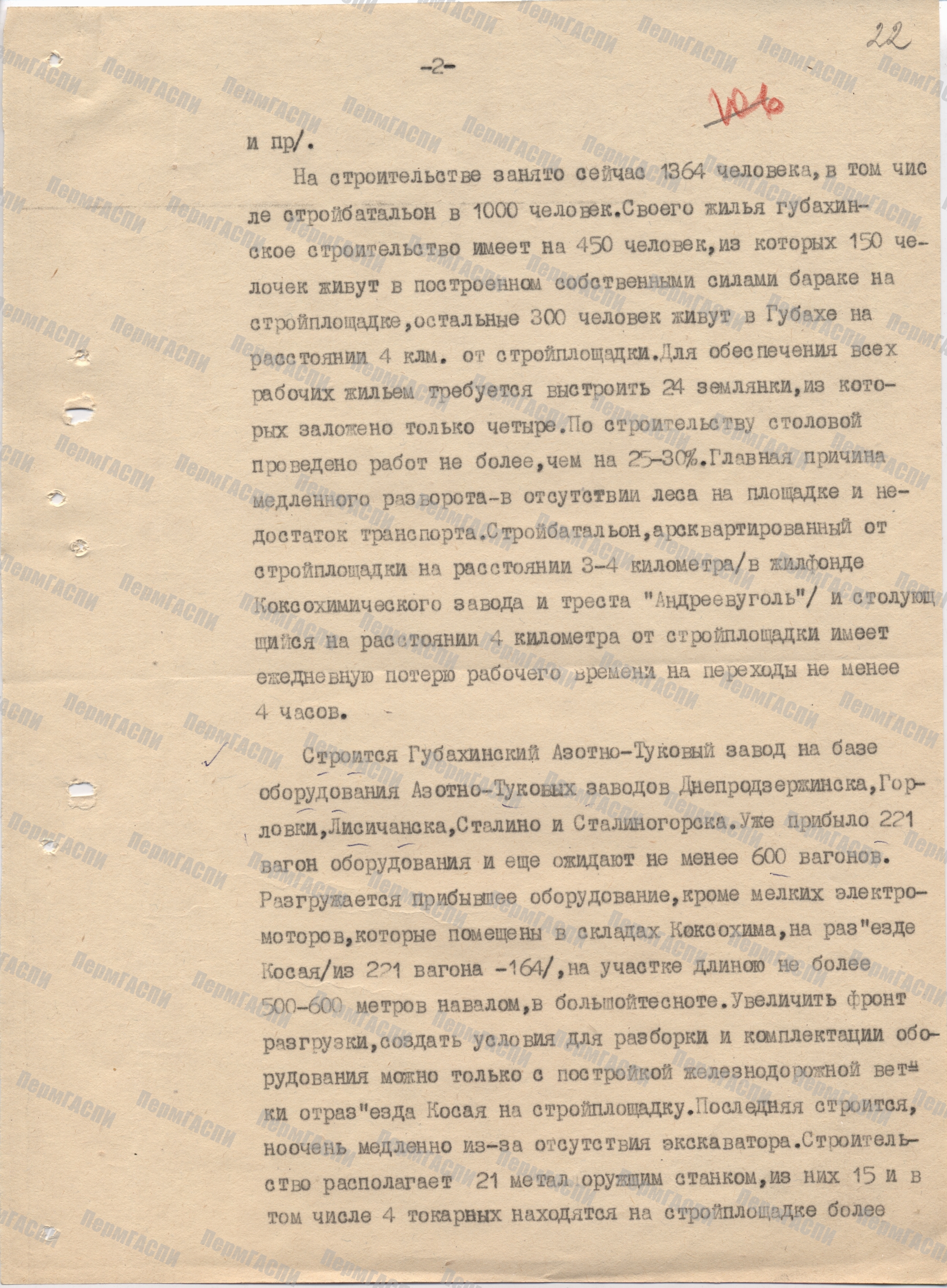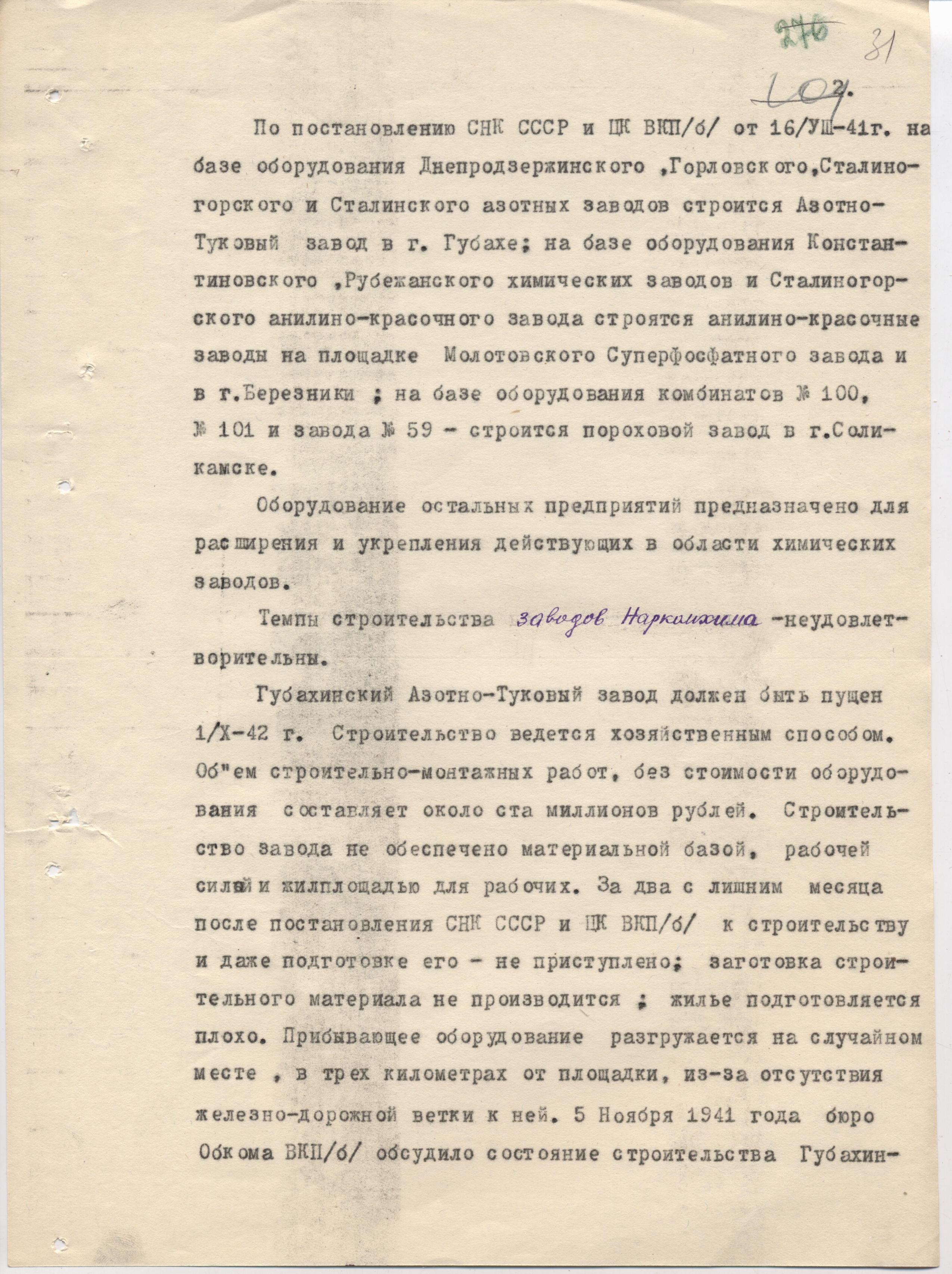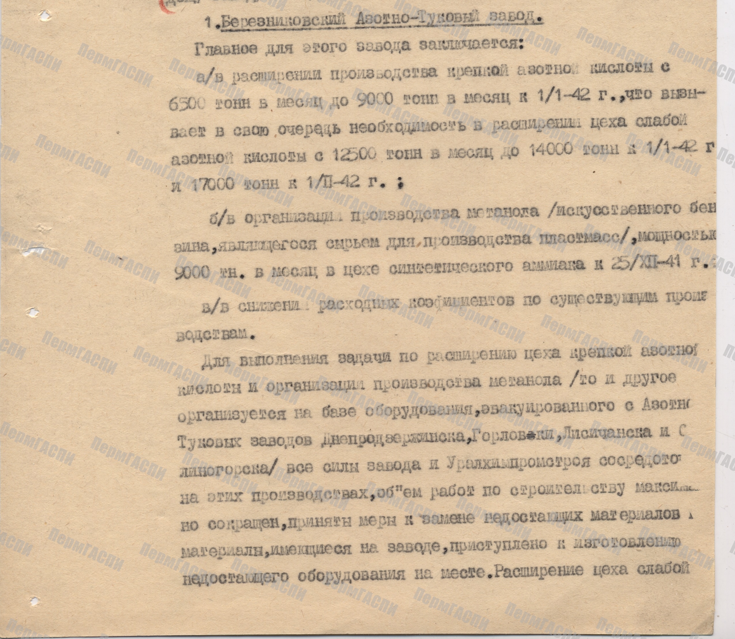 Докладная записка о строительстве Губахинского азотно-тукового завода, в которой имеются сведения о том, что на этом предприятии планируется использование эвакуированного в г. Губаху оборудования Лисичанского азотно-тукового завода (ныне – Северодонецкое объединение «Азот»). 24 декабря 1941 г. ПермГАСПИ. Ф.105. Оп.7. Д.386. Л.21-24