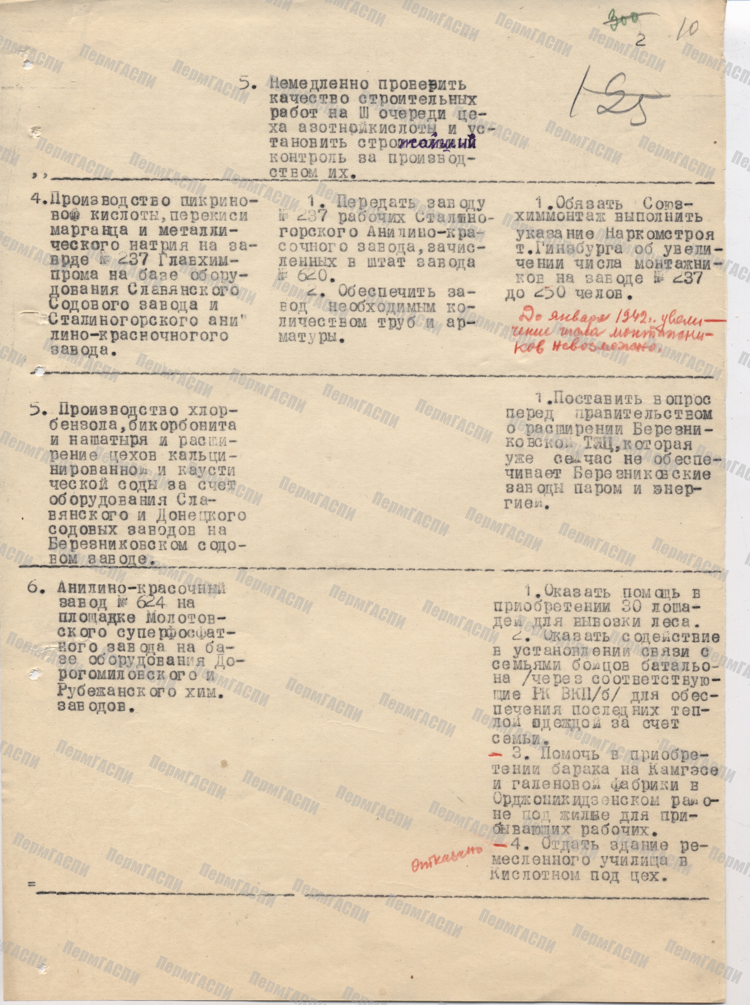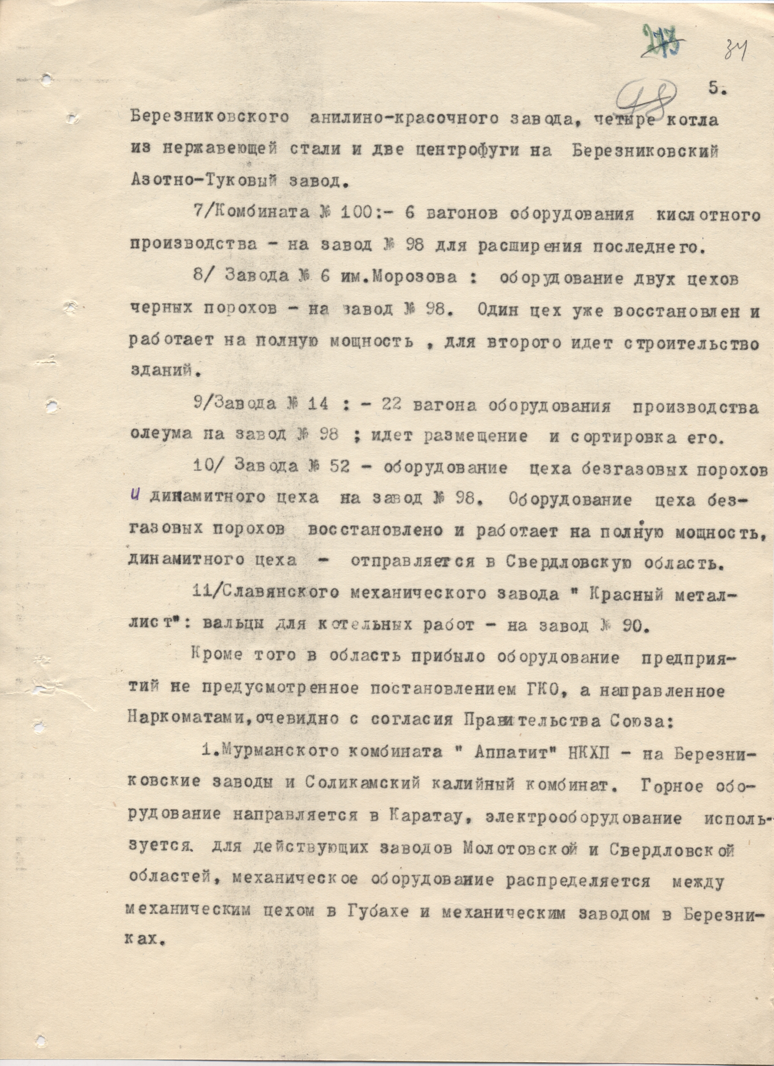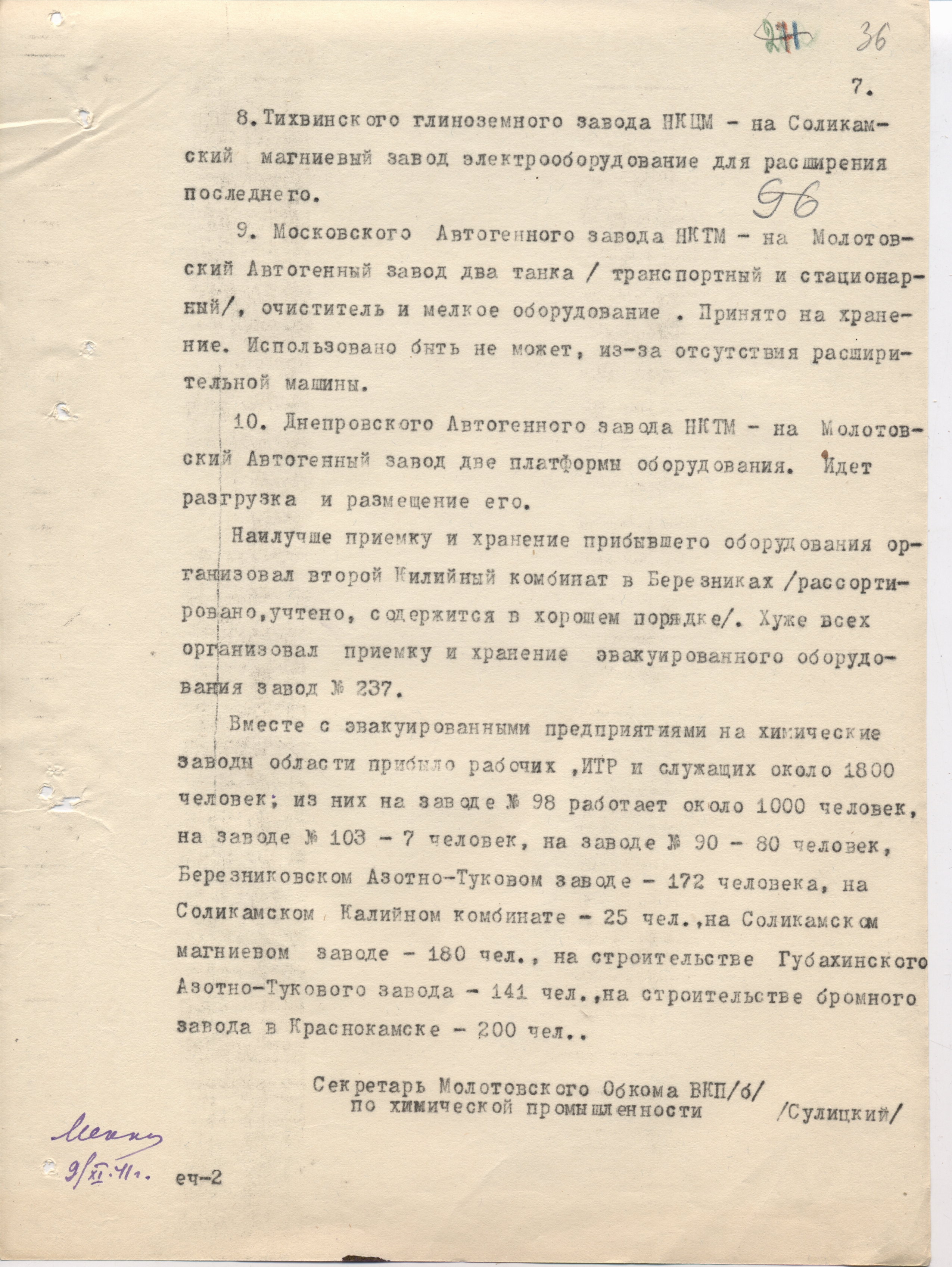 Фрагмент информационной записки о работе предприятий химической промышленности, эвакуированных из прифронтовой полосы на территорию Молотовской области. 10 ноября 1941 г. ПермГАСПИ. Ф.105. Оп.7. Д.387. Л.45