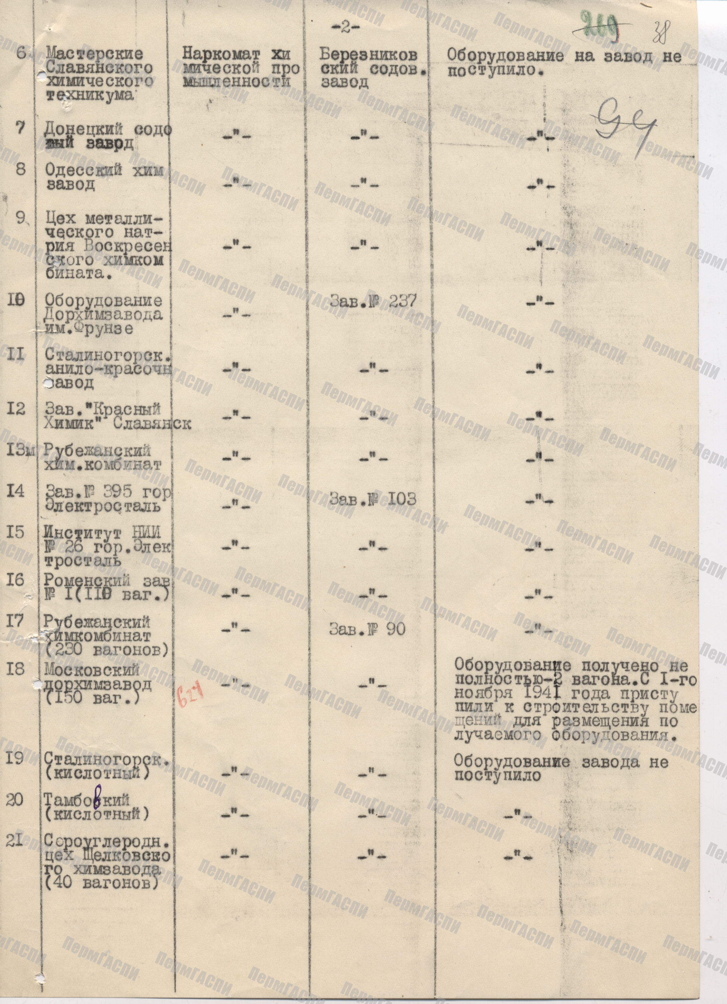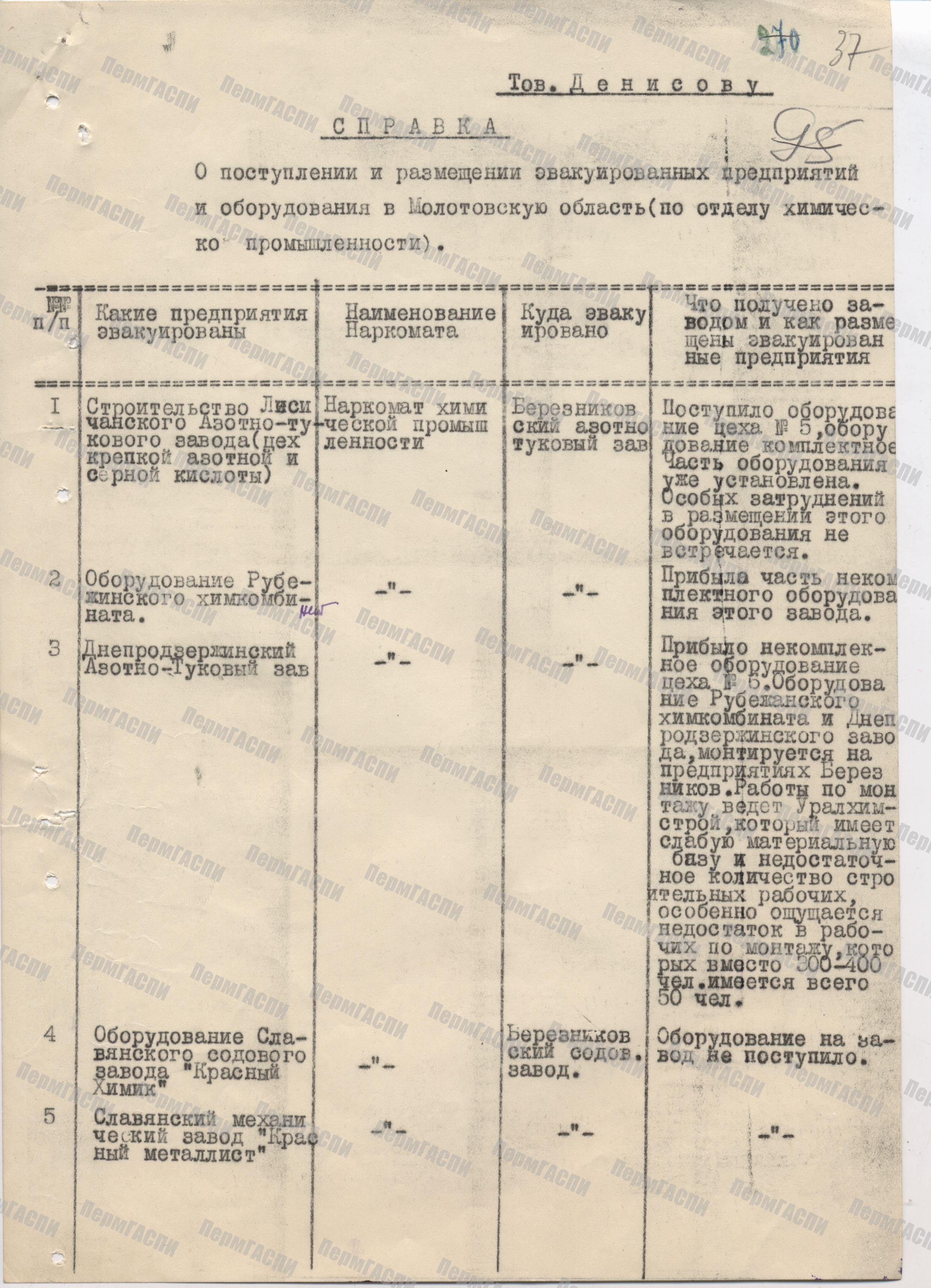 Справка о поступлении и размещении оборудования предприятий химической промышленности, эвакуированных из прифронтовой полосы на территорию Молотовской области, в которой имеются сведения об оборудовании Лисичанского азотно-тукового завода (ныне – Северодонецкое объединение «Азот»). Ноябрь 1941 г. ПермГАСПИ. Ф.105. Оп.7. Д.387. Л.37-40