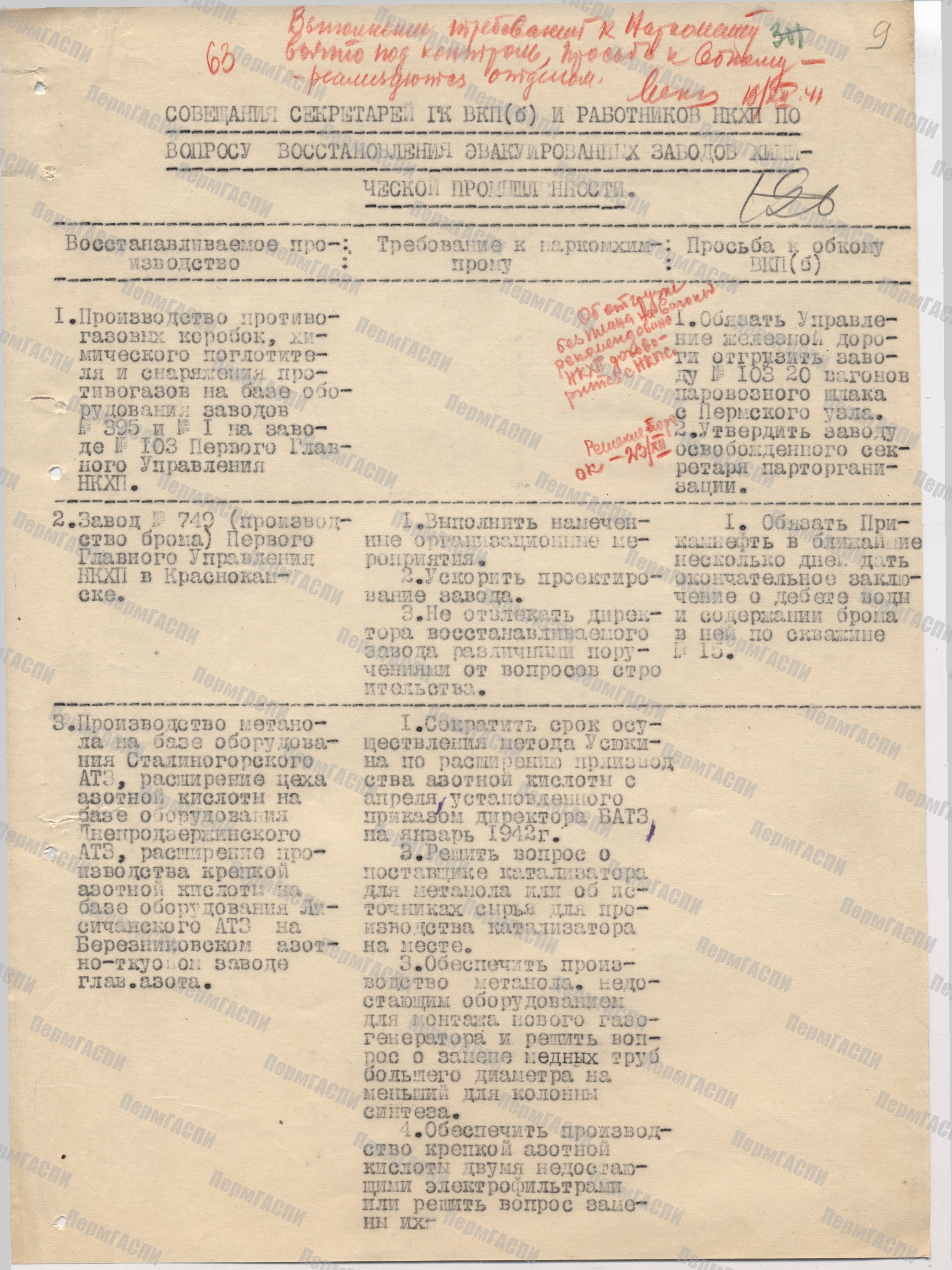 Отчет о результатах совещания секретарей горкомов ВКП(б) Молотовской области и работников Народного комиссариата химической промышленности СССР по вопросу восстановления эвакуированных на Урал предприятий химической промышленности, в котором имеется информация об оборудовании Лисичанского азотно-тукового завода (ныне – Северодонецкое объединение «Азот»). 8 декабря 1941 г. ПермГАСПИ. Ф.105. Оп.7. Д.387. Л.9-11
