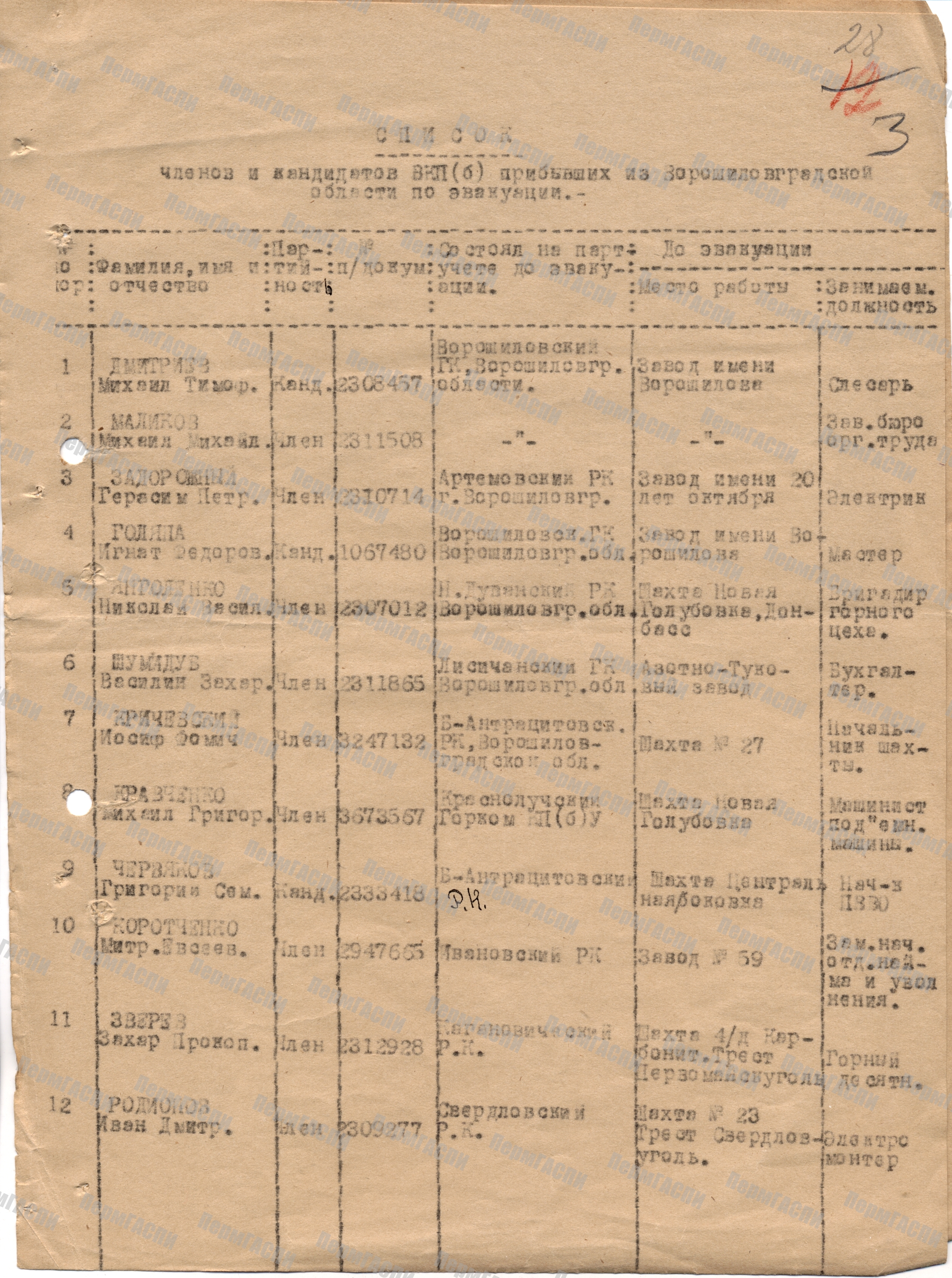 Список членов и кандидатов в члены ВКП(б), эвакуированных в Моло-товскую область из Ворошиловградской области. 1942 г. ПермГАСПИ. Ф.105. Оп.8. Д.192. Л.28-29