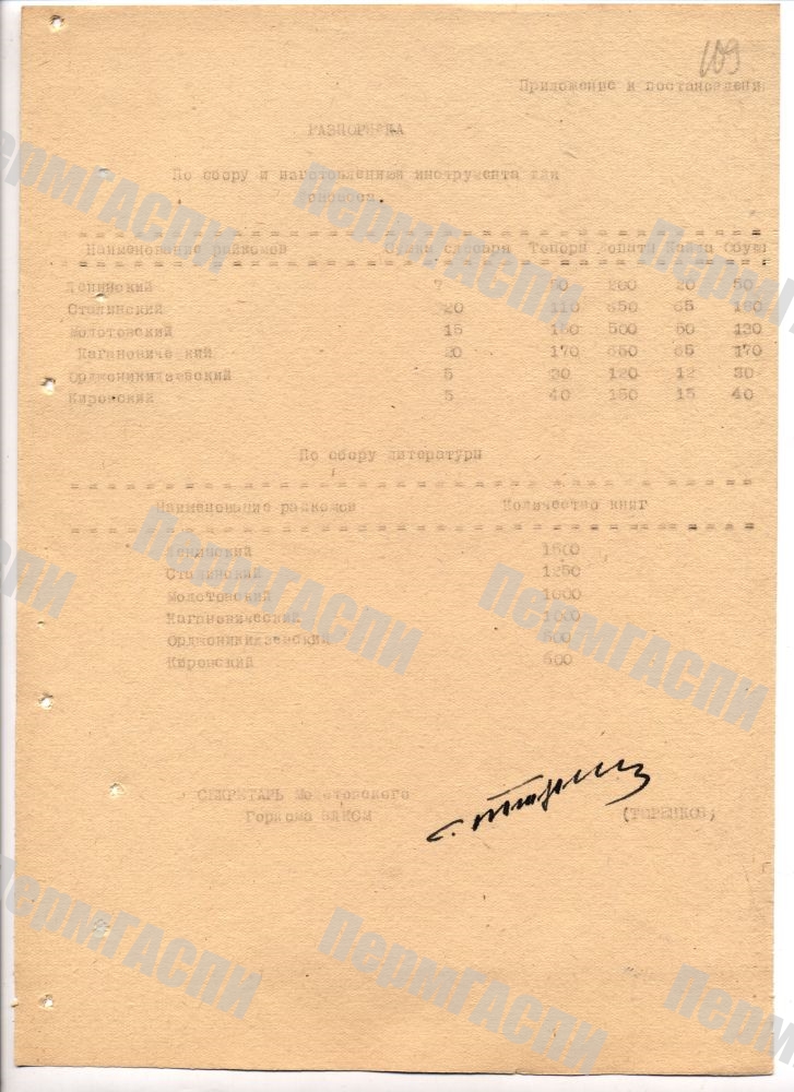 Справка о выполнении разнарядки Молотовского обкома ВЛКСМ по изготовлению на предприятиях Молотовской области инструментов и о сборе на территории области художественной литературы для отправки на Донбасс. 25 февраля 1944 г. ПермГАСПИ. Ф.1458. Оп.1. Д.392. Л.29-30
