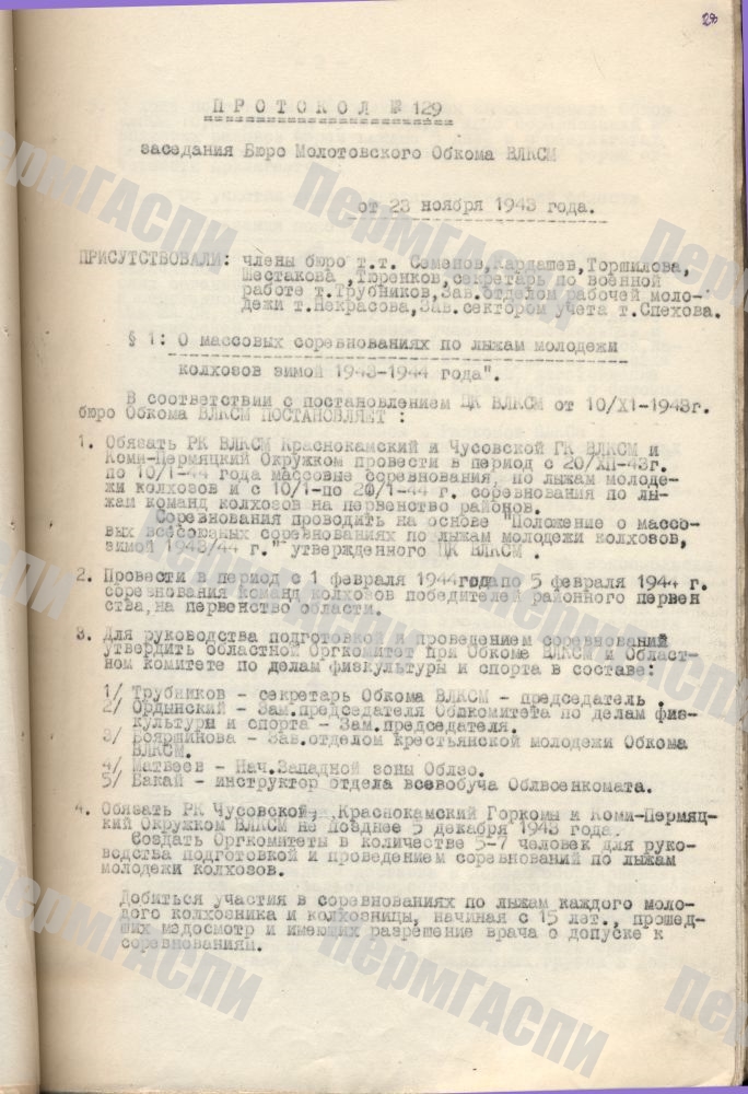 Протокол заседания бюро Молотовского обкома ВЛКСМ от 23 ноября 1943 г., на котором рассматривался вопрос об участии комсомольцев Молотовской области в оказании помощи Донбассу.ПермГАСПИ. Ф.1458. Оп.1. Д.384. Л.28-30, 36