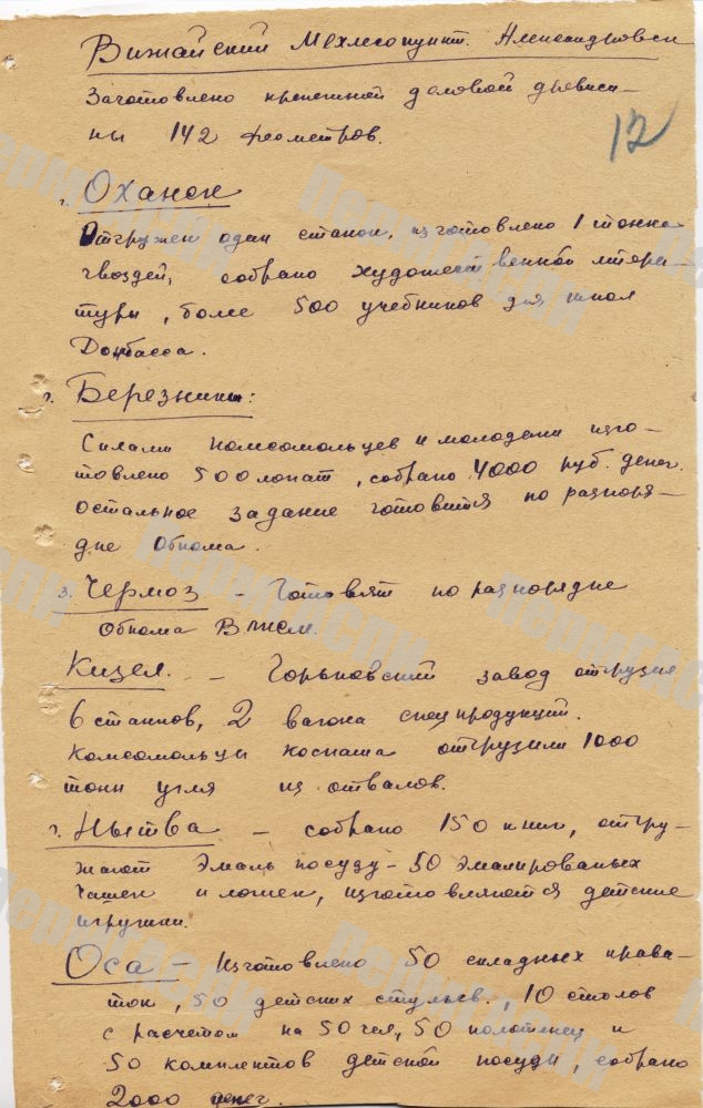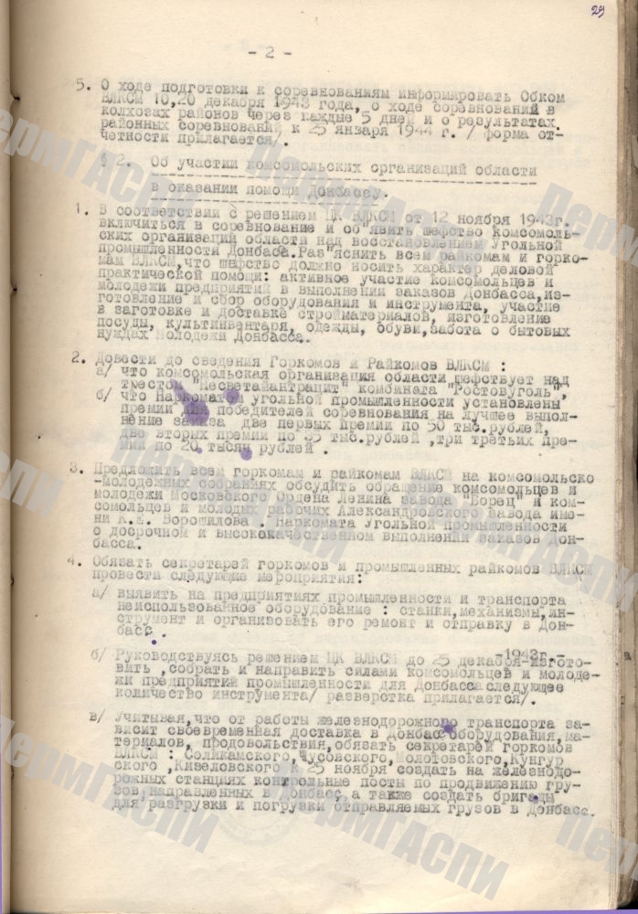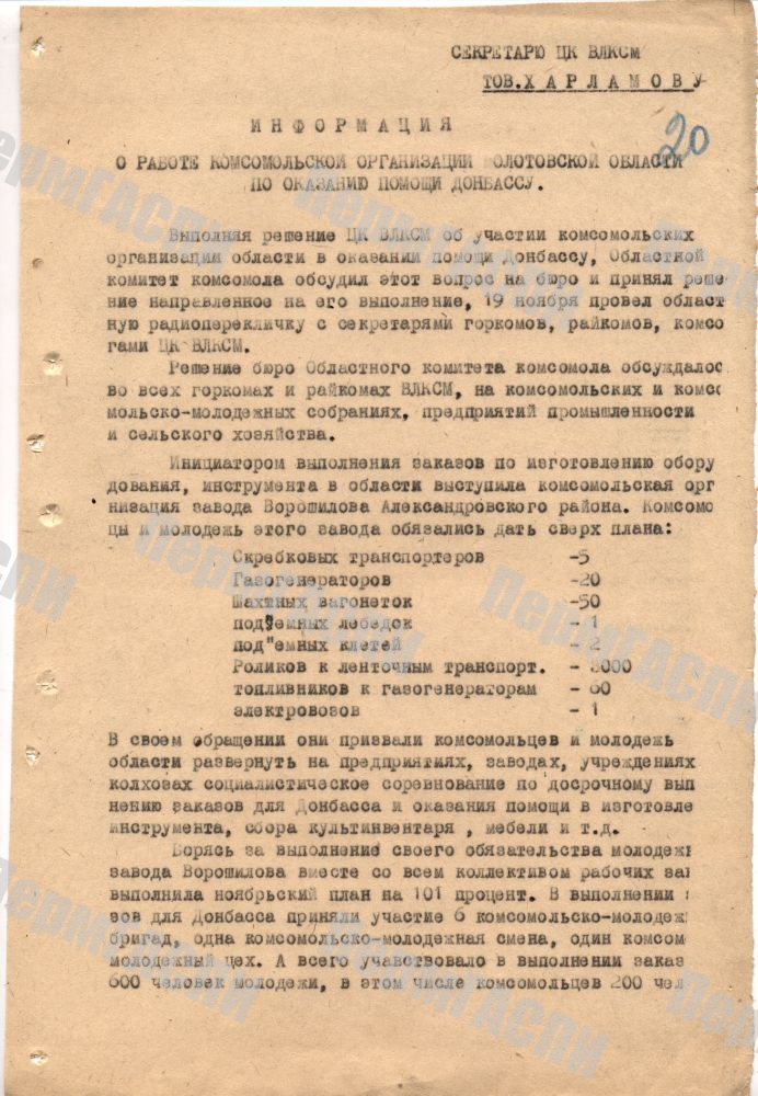 Информационная записка о работе комсомольских организаций Молотовской области по оказанию помощи Донбассу. Декабрь 1943 г. ПермГАСПИ. Ф.1458. Оп.1. Д.392. Л.20-22