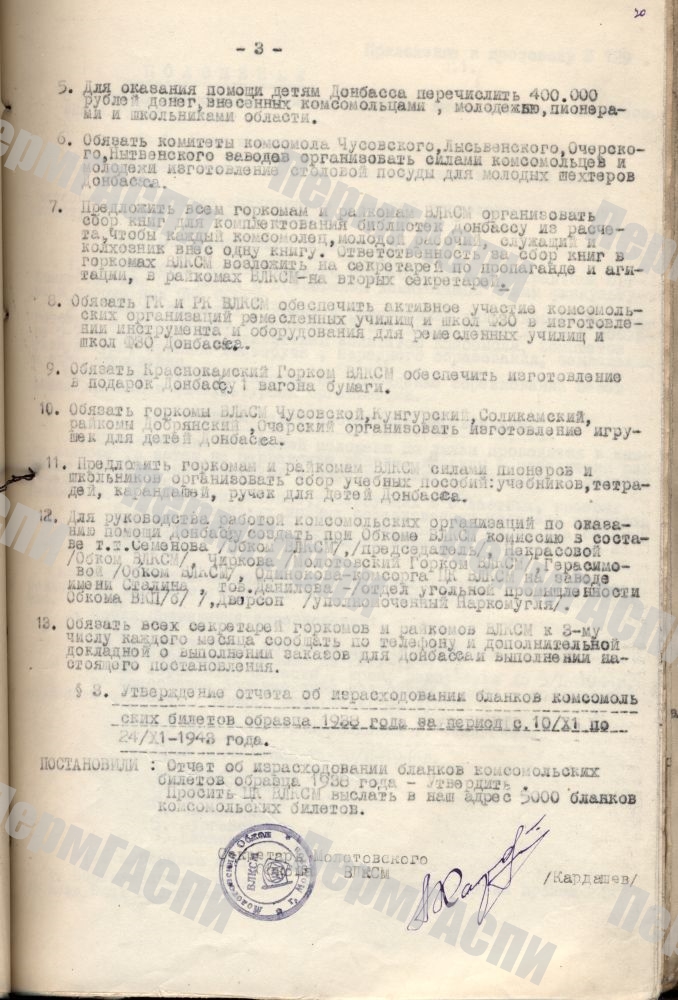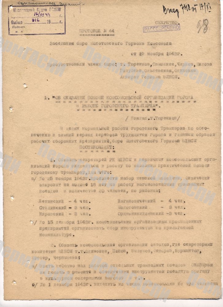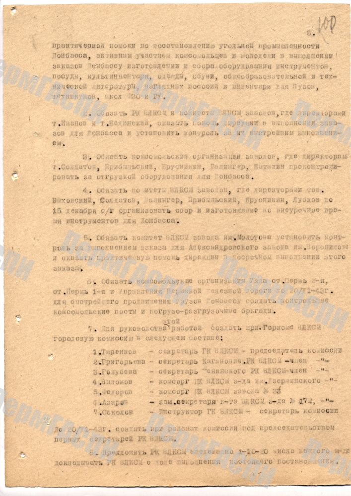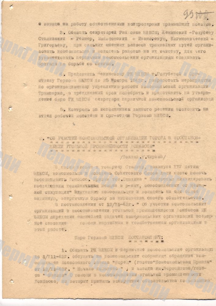 Фрагмент протокола заседания бюро Молотовского горкома ВЛКСМ от 19 ноября 1943 г., на котором рассматривался вопрос об участии комсомольцев г. Молотова в оказании помощи Донбассу.ПермГАСПИ. Ф.1753. Оп.1. Д.48. Л.98-100, 109