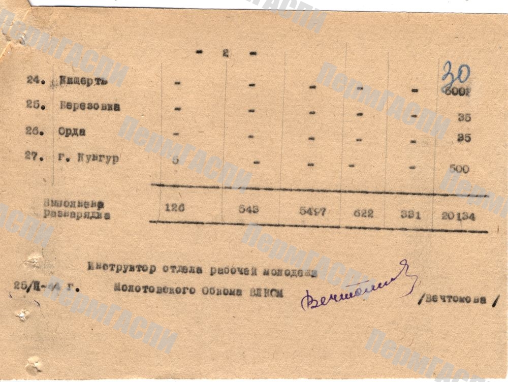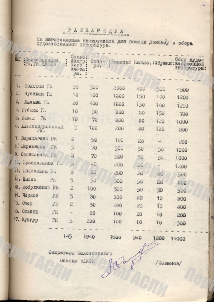 Разнарядка Молотовского обкома ВЛКСМ по сбору инструментов в сельскохозяйственных районах Молотовской области для отправки на Донбасс. Январь 1944 г. ПермГАСПИ. Ф.1458. Оп.1. Д.392. Л.27