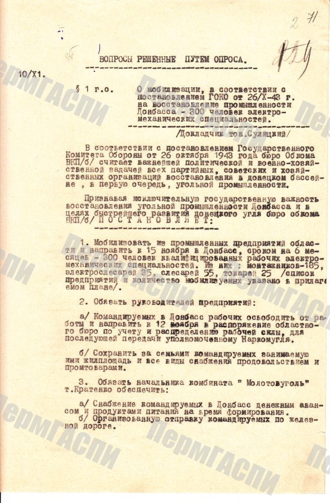 Фрагмент протокола заседания бюро Молотовского обкома ВКП(б) от 11 ноября 1943 г., на котором рассматривался вопрос о мобилизации на территории Молотовской области специалистов для восстановления промышленности Донбасса. ПермГАСПИ. Ф.105. Оп.9. Д.43. Л.70-72