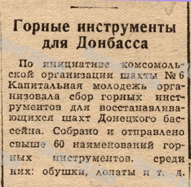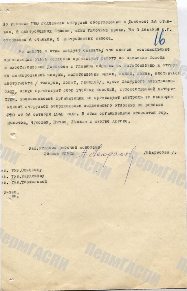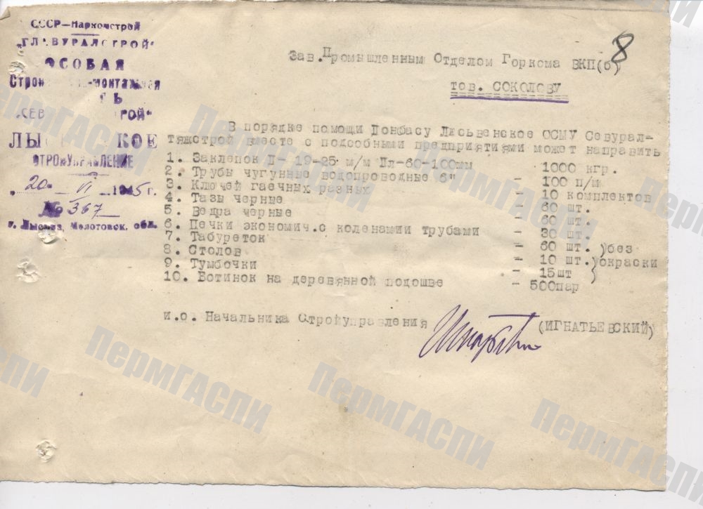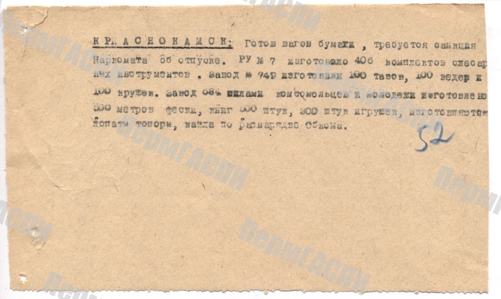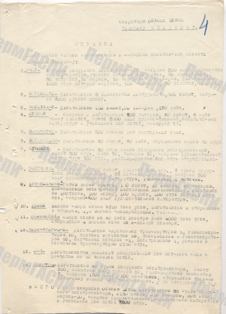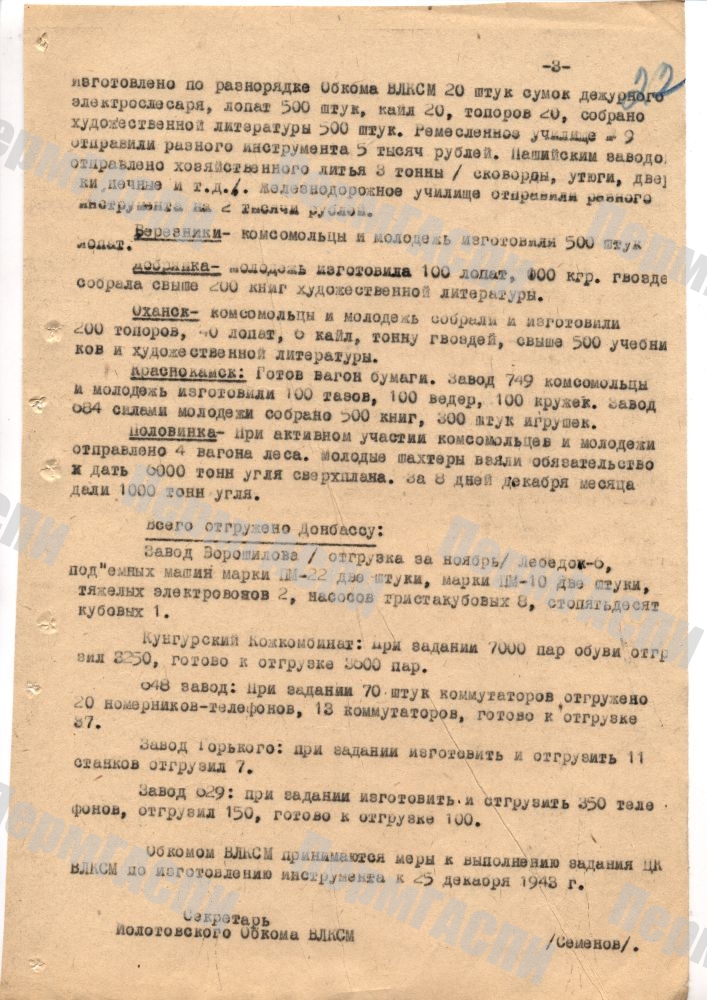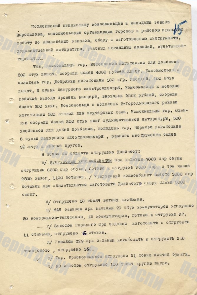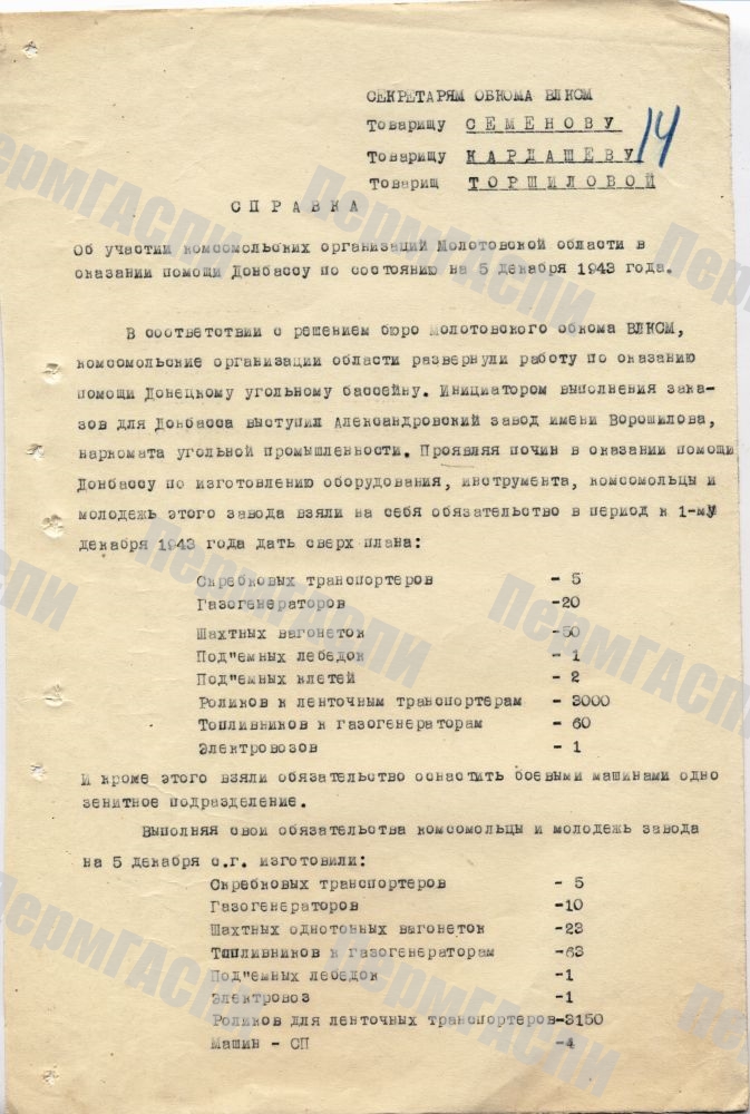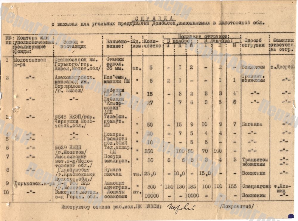 Информационная записка об изготовлении на предприятиях Молотов-ской области сверхплановой продукции для отправки ее на Донбасс. 3 декабря 1943 г. ПермГАСПИ. Ф.1458. Оп.1. Д.392. Л.48