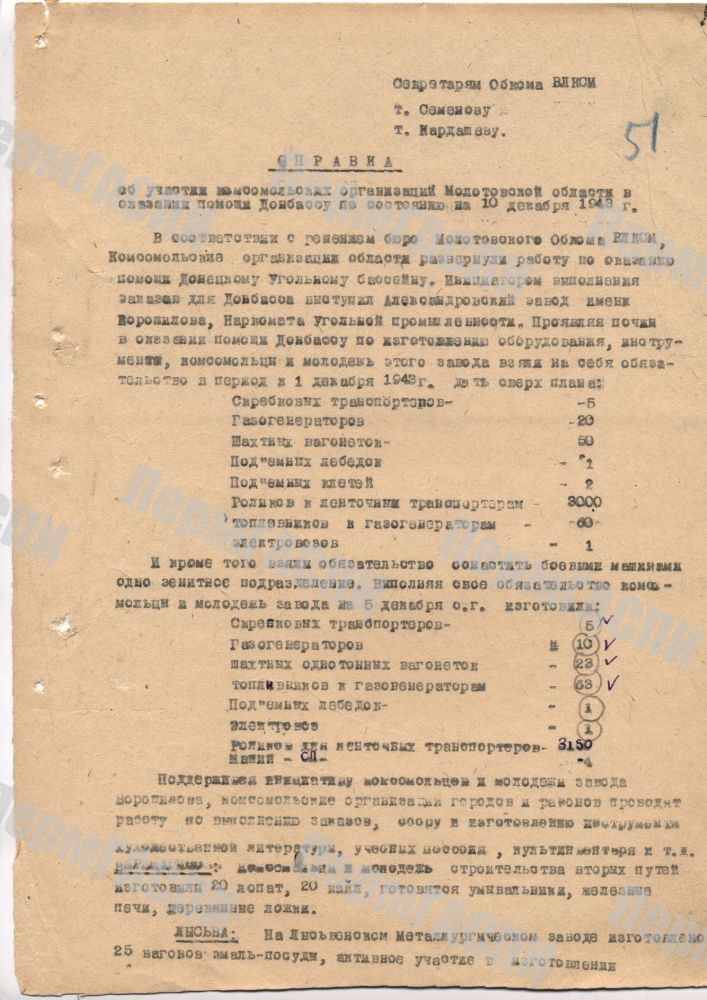 Справка об участии комсомольских организаций Молотовской области в оказании помощи Донбассу по состоянию на 10 декабря 1943 г. 13 декабря 1943 г. ПермГАСПИ. Ф.1458. Оп.1. Д.392. Л.51-54