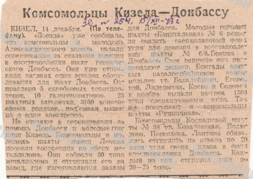 Заметка, опубликованная в номере газеты «Звезда» от 15 декабря 1943 г. ПермГАСПИ. Ф.90. Оп.1. Д.417. Л.1