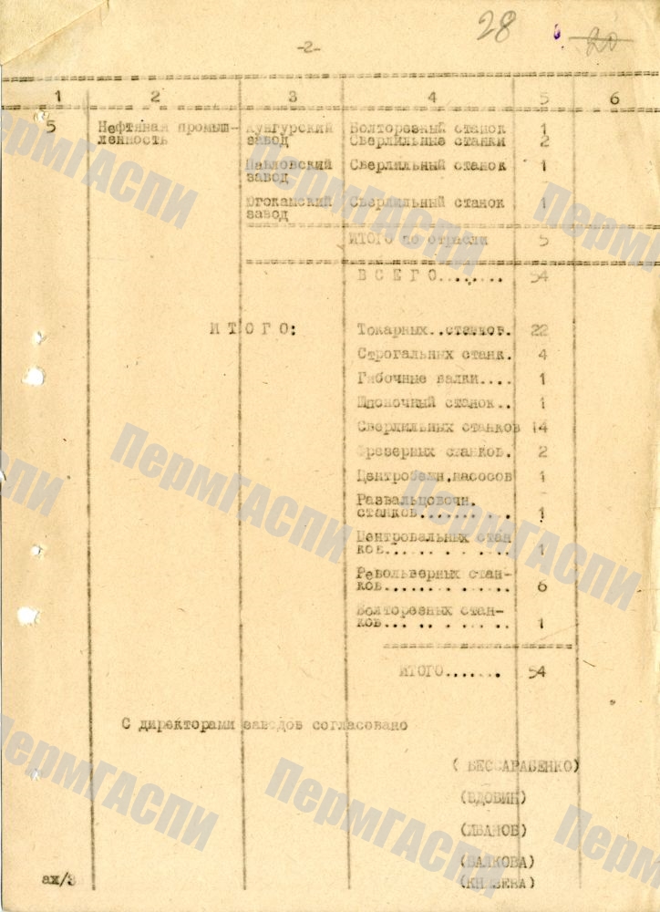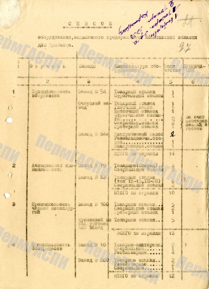Список оборудования, выделенного предприятиями Молотовской области для отправки на Донбасс. 1943 г. ПермГАСПИ. Ф.105. Оп.9. Д.201. Л.27-28